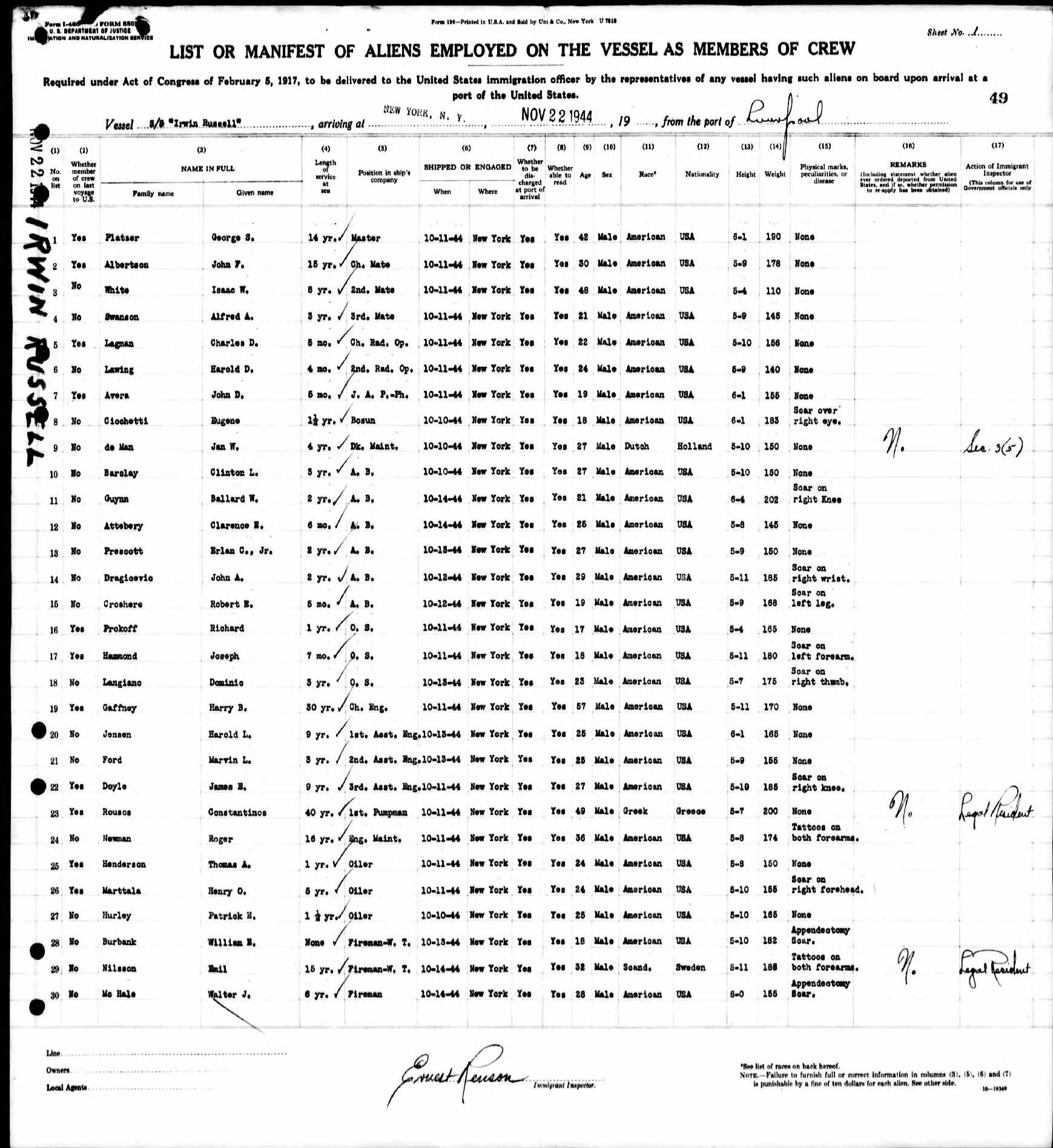 1944 Ship Manifest Liverpool, England to New York, Line 18