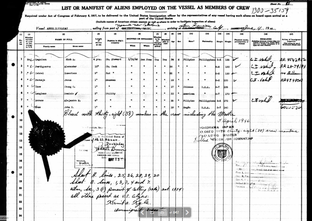 1946 New Caledonia, France to San Francisco, Line 6