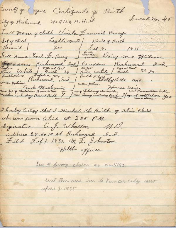 1923 Birth Record Page 1
