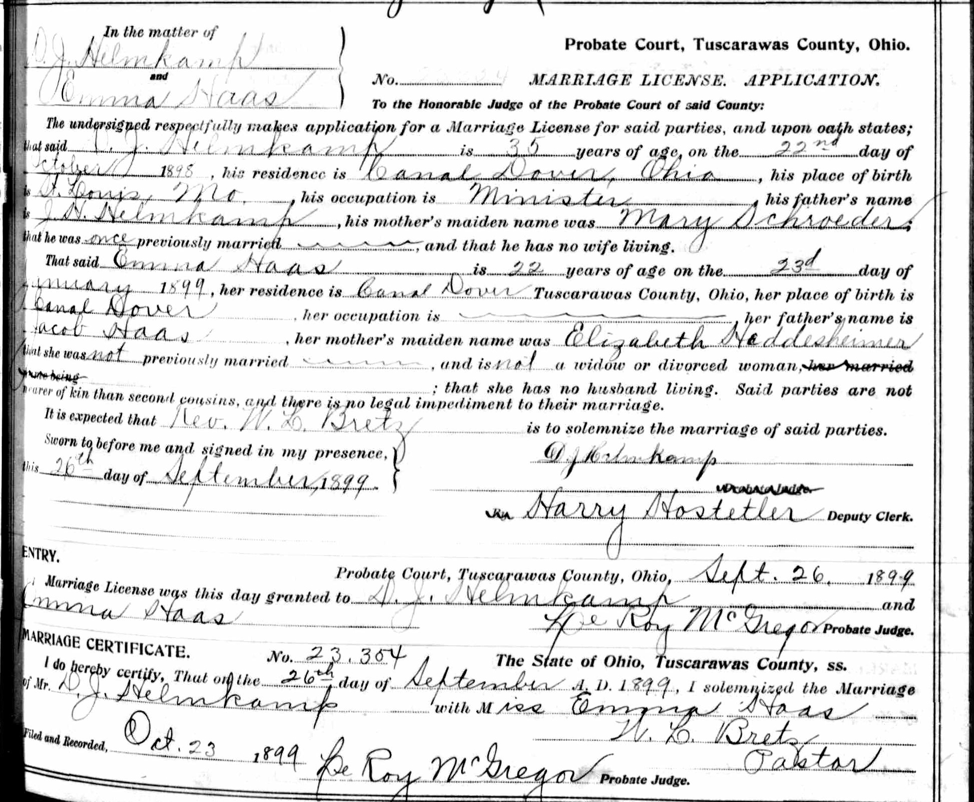 Rev. Daniel John Helmkamp were married on September 26, 1899 in Tuscarawas, Ohio, USA. She died on September 23, 1945, at age 68, in Akron, Summit, Ohio, USA. She was buried in Maple Grove Cemetery, Dover, Ohio.