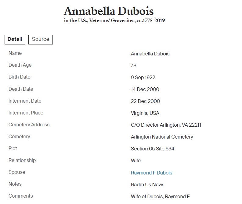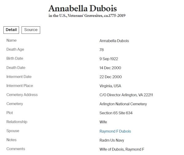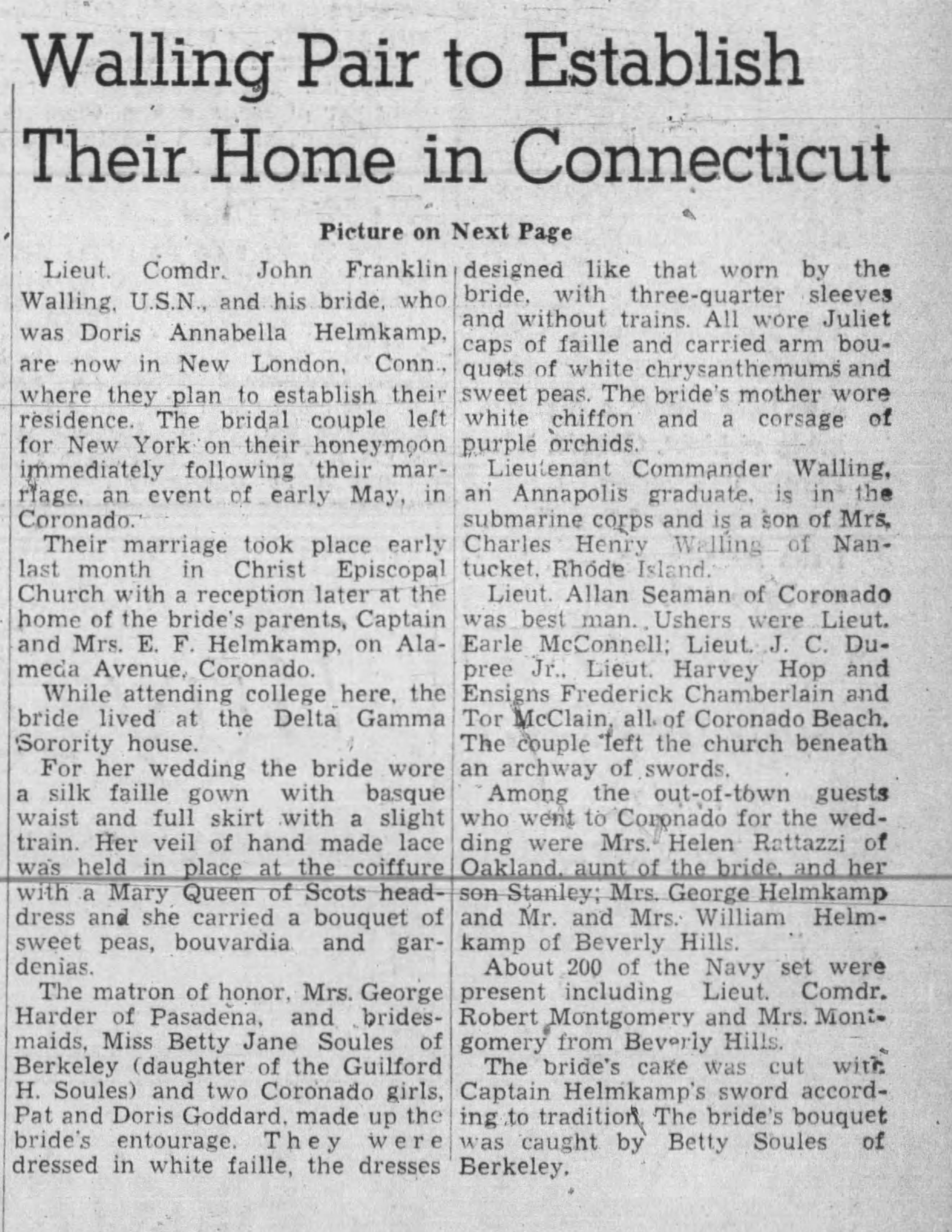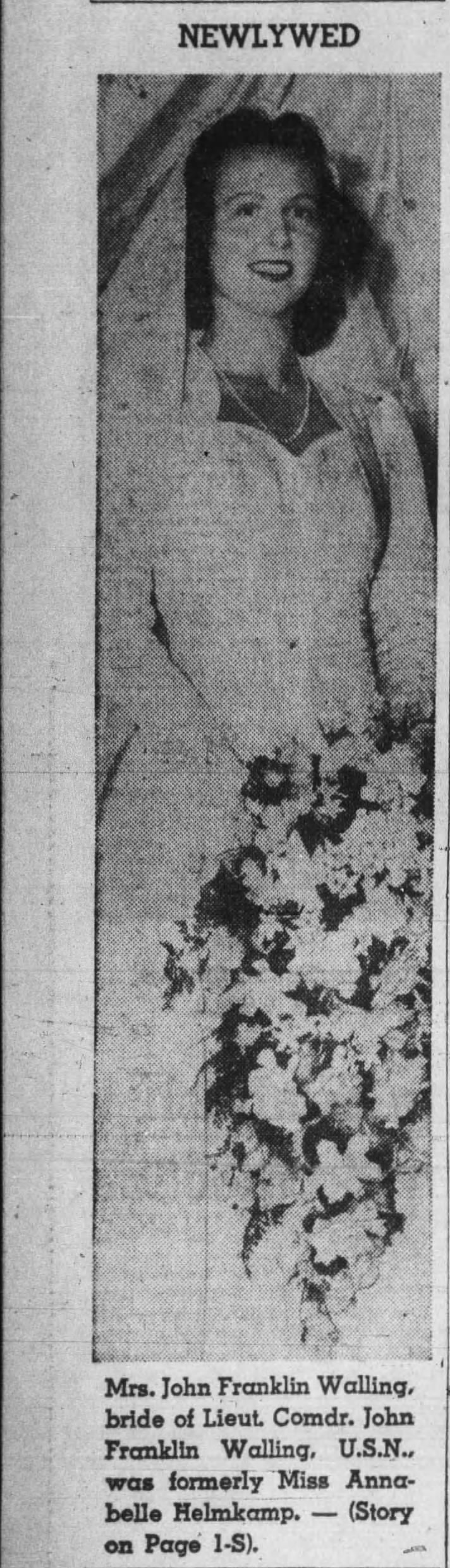 John Franklin Walling were married in May 1943 in Coronado, San Diego, California, USA. She died on December 14, 2000, at age 78, in Alexandria, Virginia, USA. She was buried in Arlington National Cemetery, Arlington, Virginia.