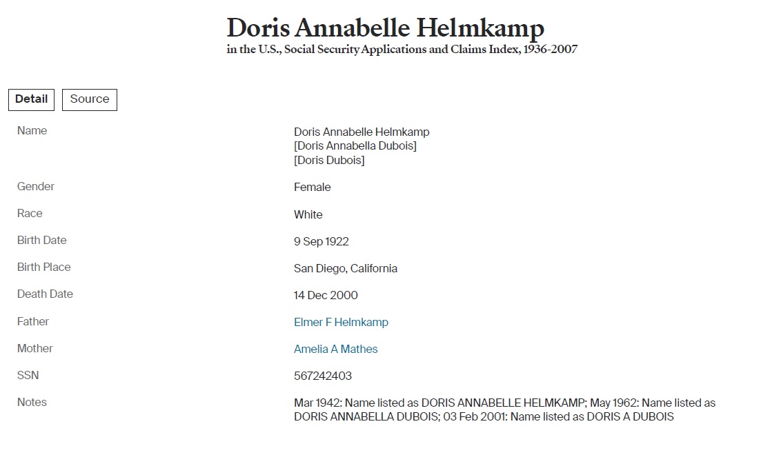 Doris Annabella Helmkamp was born on September 9, 1922 in San Diego, California, USA. She and
