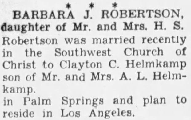 Barbara Jeanette Robertson were married on March 13, 1947 in Palm Springs, Riverside, California, USA. He and