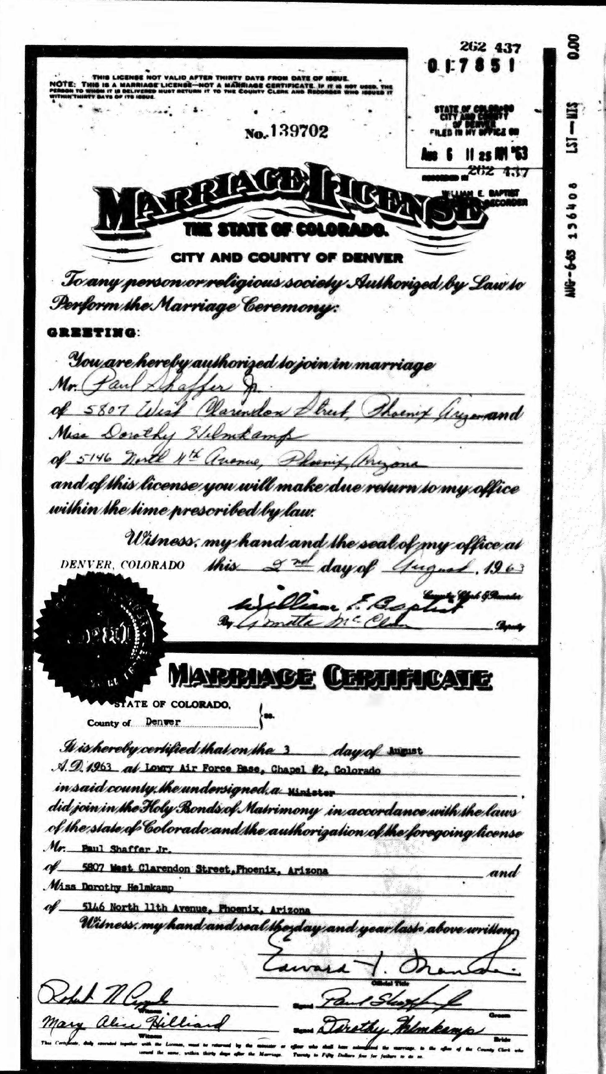 Paul Shaffer, Jr., were married on August 3, 1963 in Lowry Air Force Base, Denver, Colorado. She died.