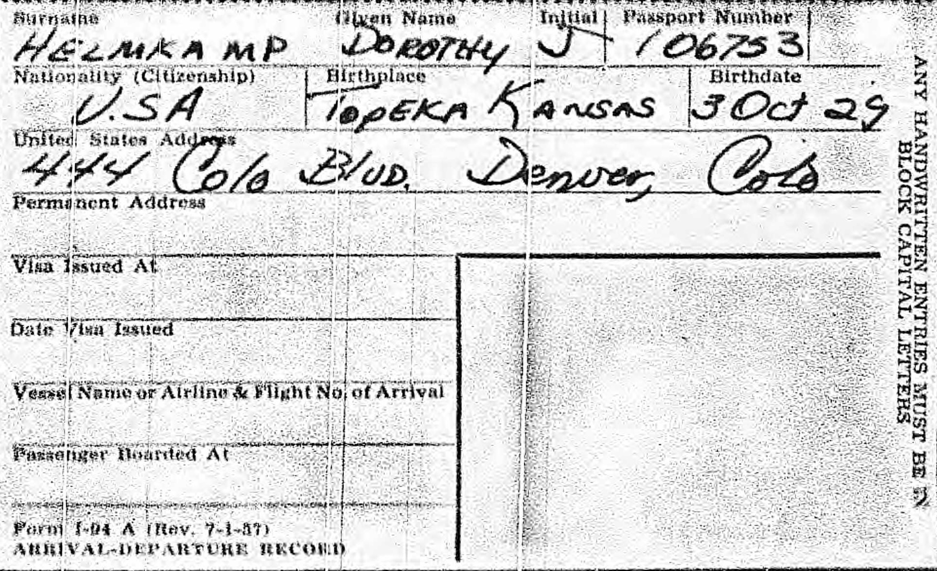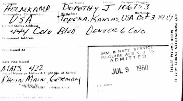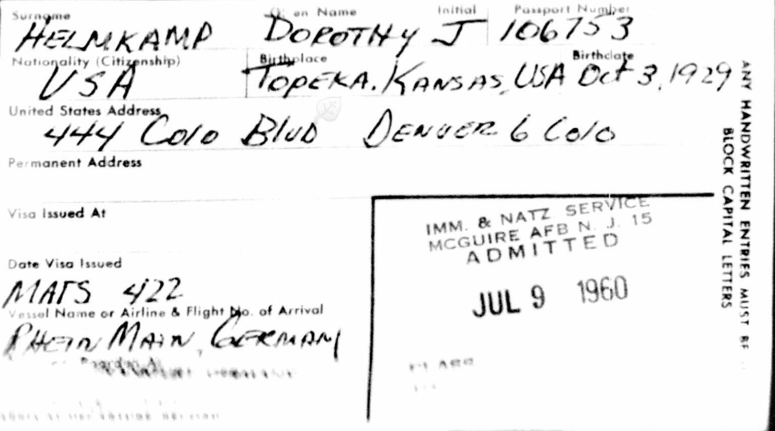 Dorothy Helmkamp 1960 Flight Arrival Visa (Germany)