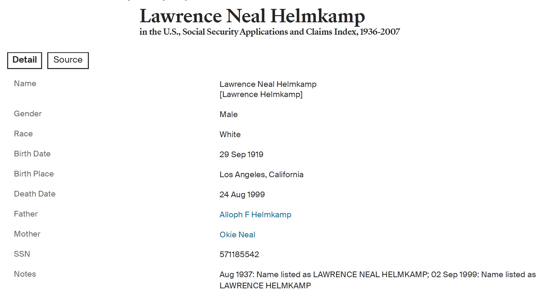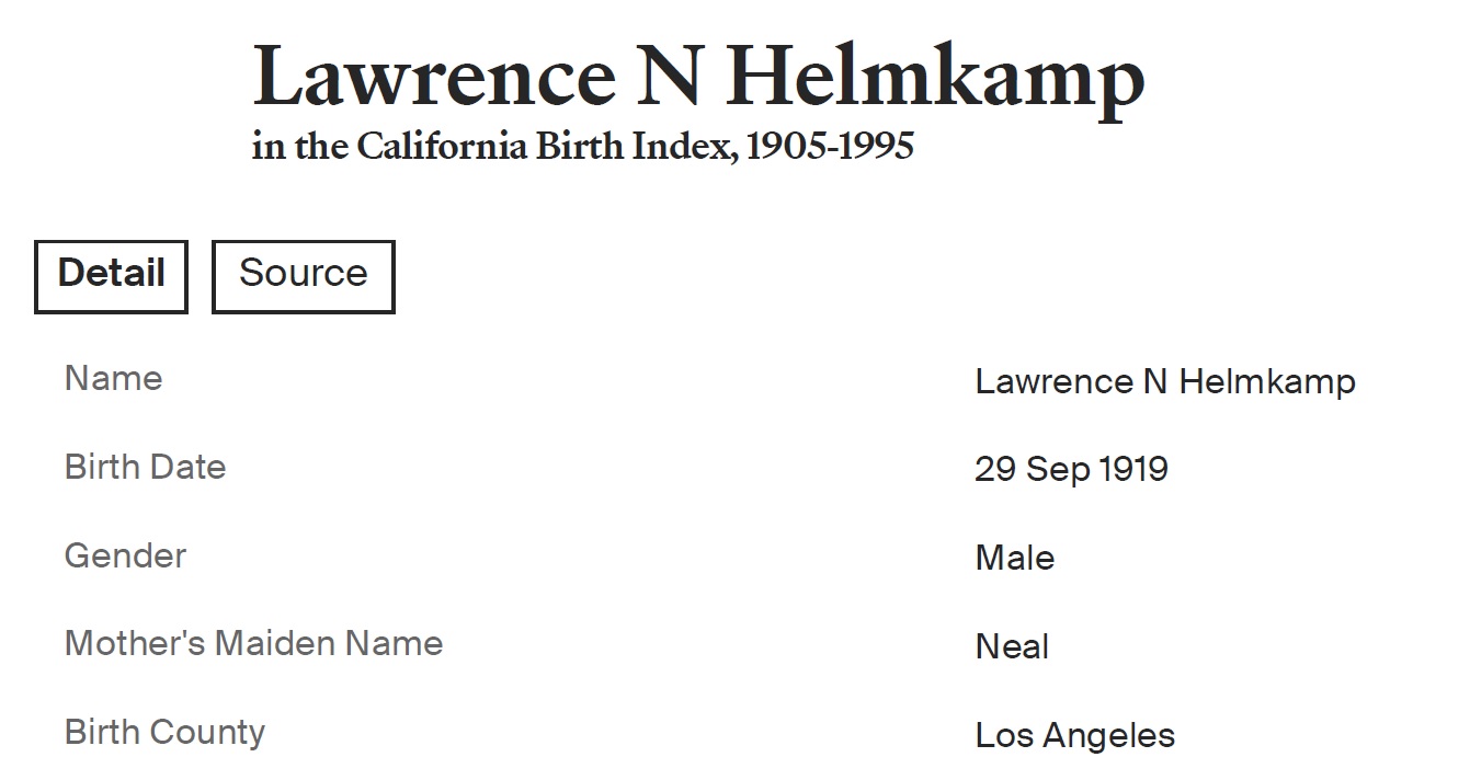 Lawrence Neal Helmkamp was born on September 29, 1919 in Los Angeles, California, USA. He and