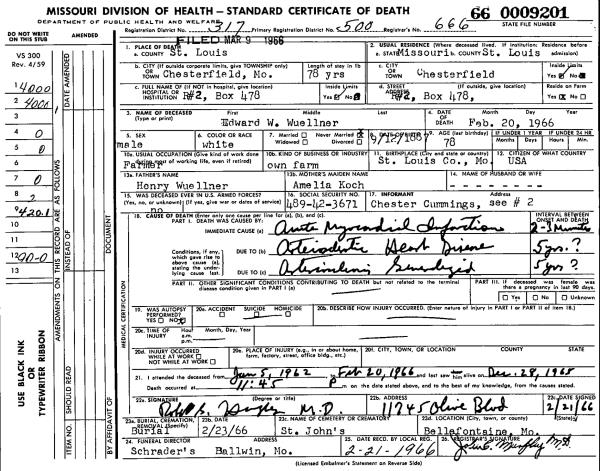 Edward Wuellner was born on September 12, 1887 in St. Louis, Missouri, USA. He died on February 20, 1966, at age 78, in Chesterfield, St. Louis, Missouri, USA. He was buried in St. John's Cemetery, Bellefontaine, Missouri.