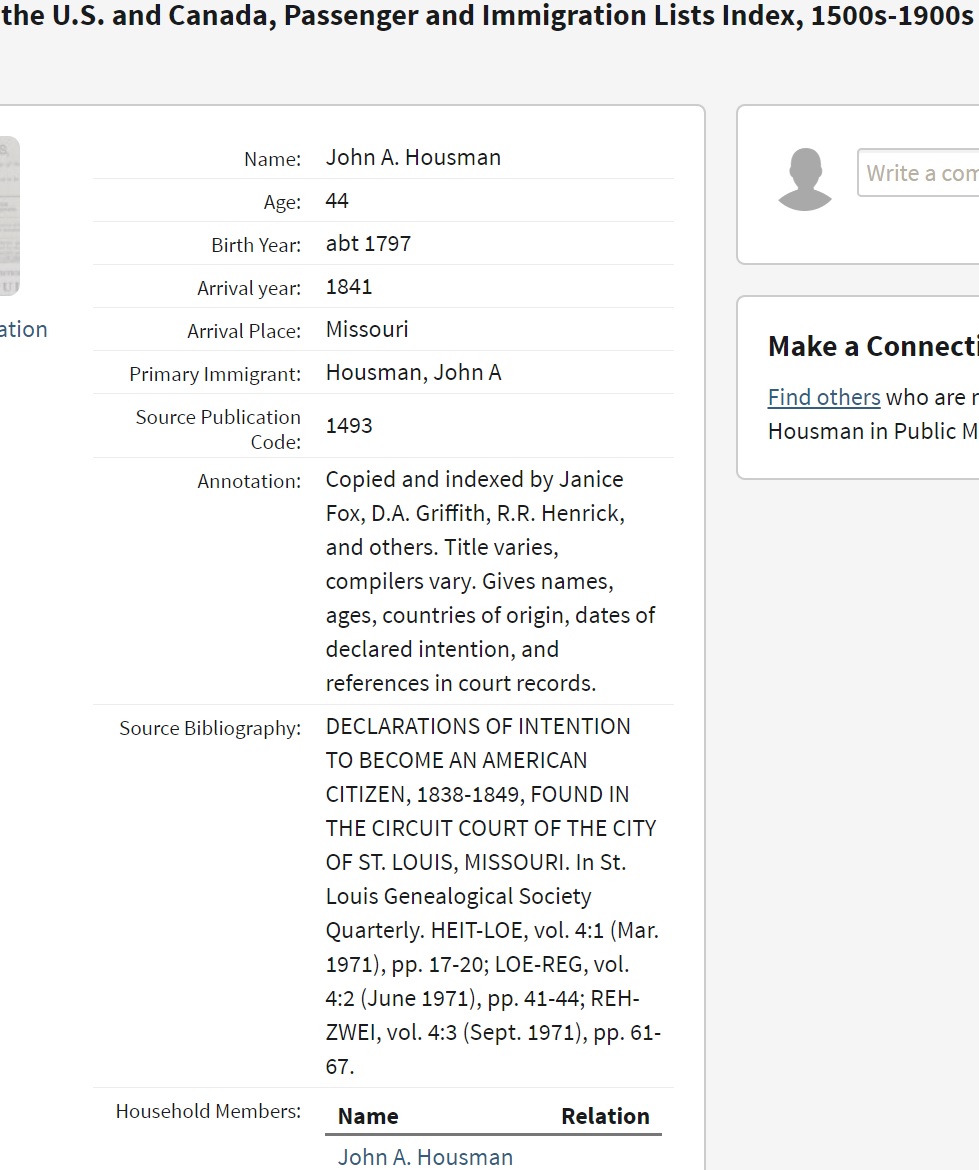 Hausman Family 1850 Federal Census Missouri, Lines 1-7