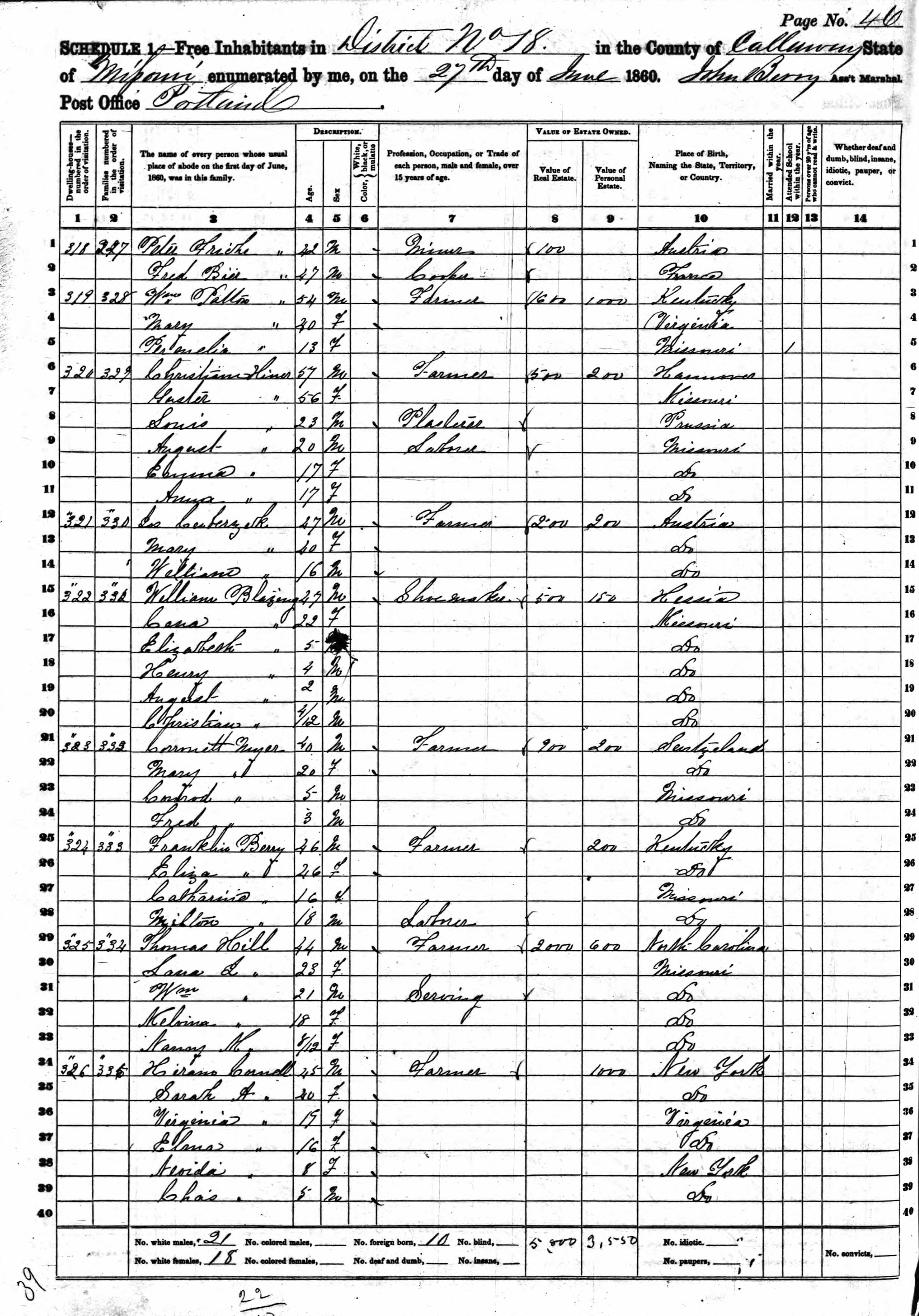Blasing Family 1860 Federal Census Missouri, Lines 15-20