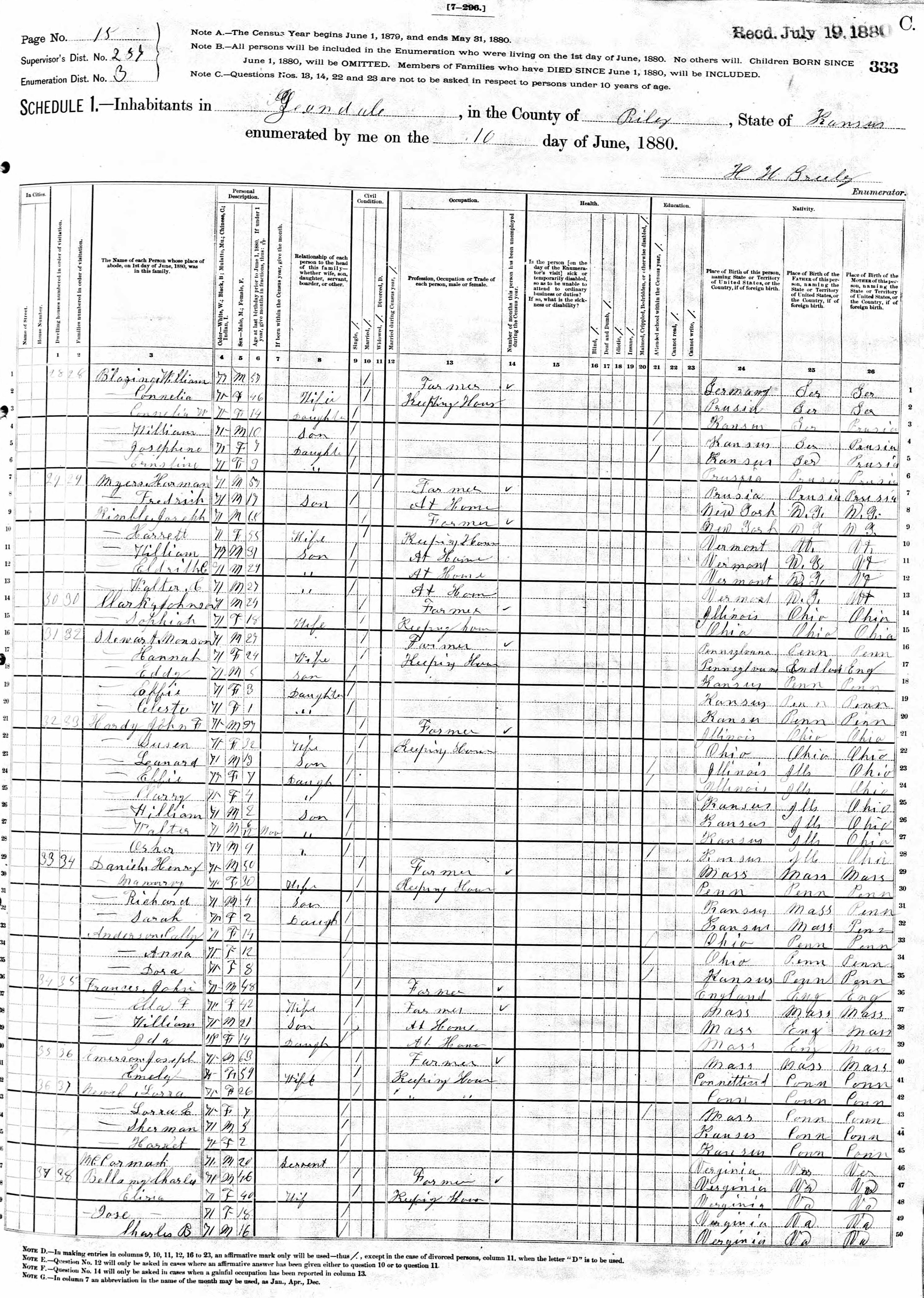 Blasing Family 1880 Federal Census Kansas, Lines 1-6