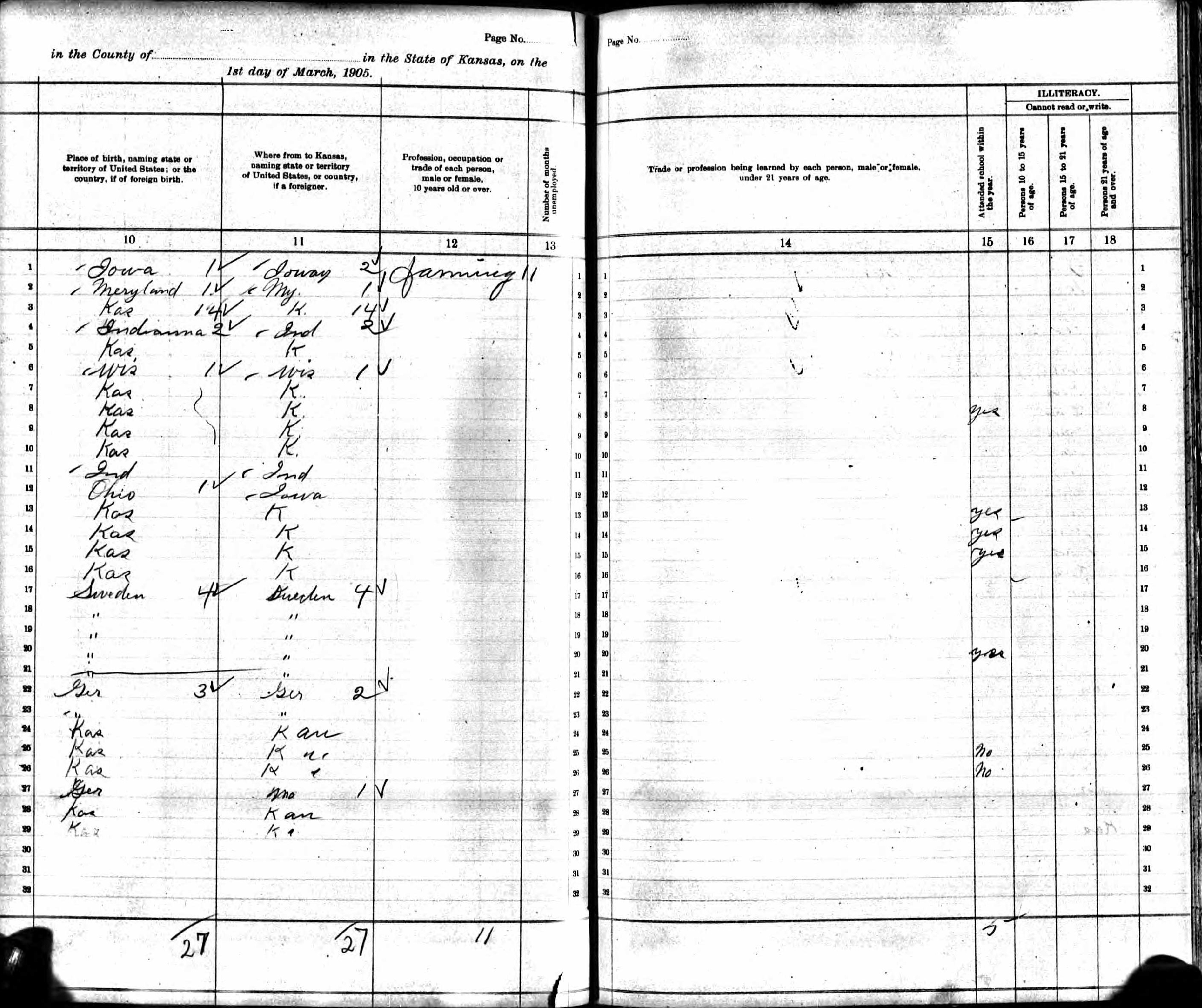 Blasing Family 1905 State Census Kansas, Lines 27-32 Page 1