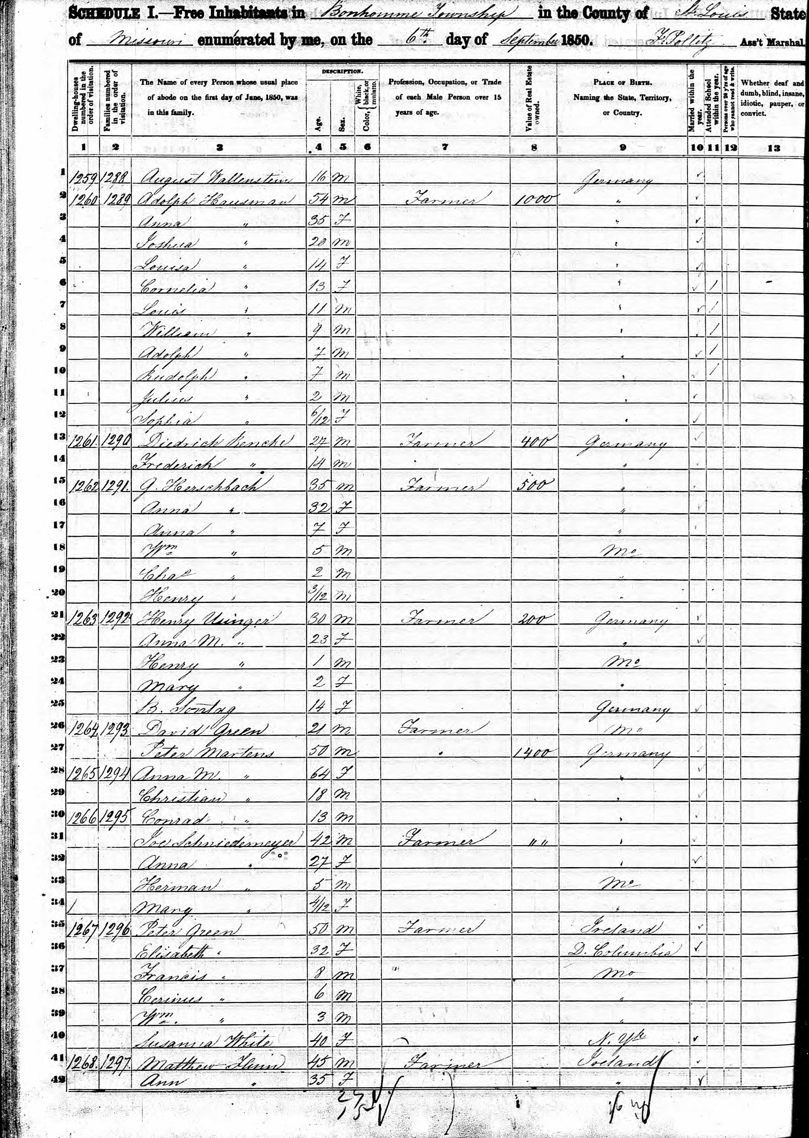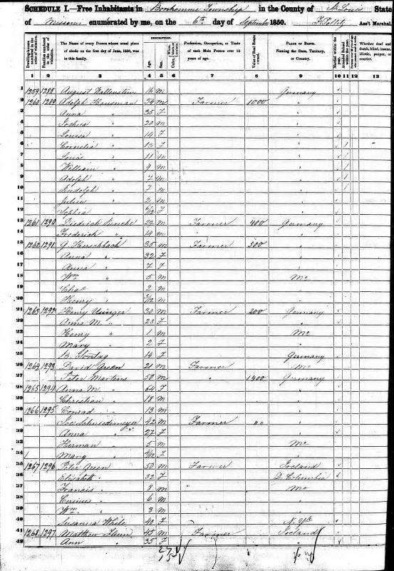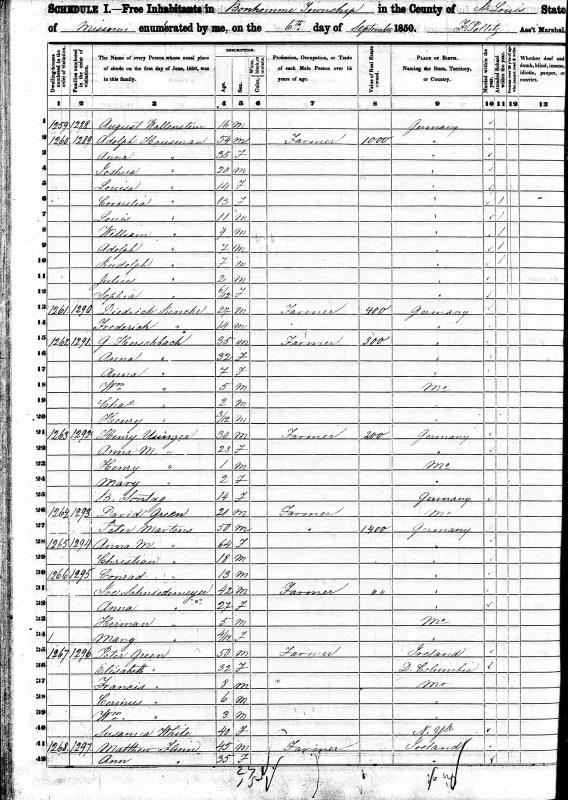 Hausman Family 1850 Federal Census Missouri, Lines 2-12