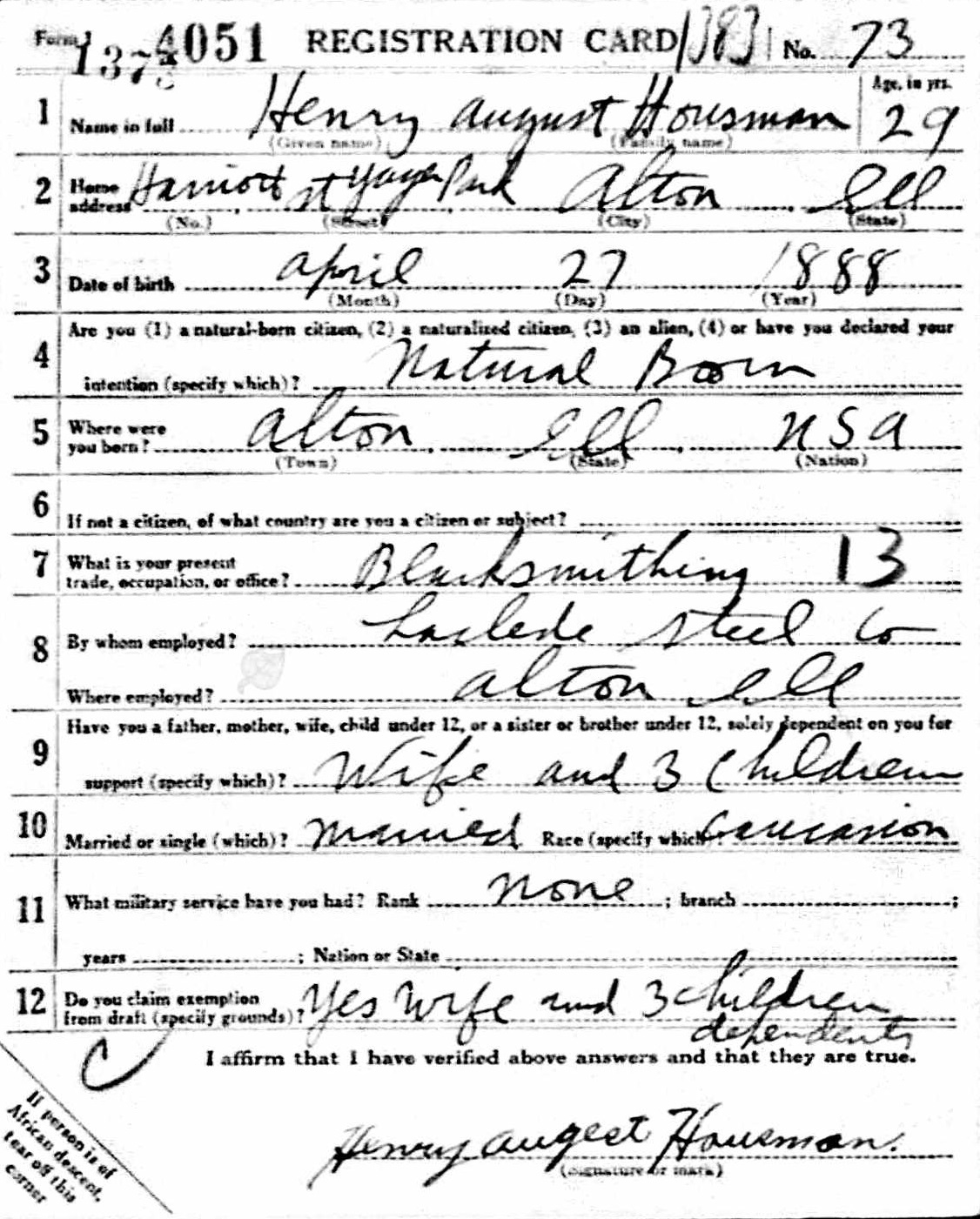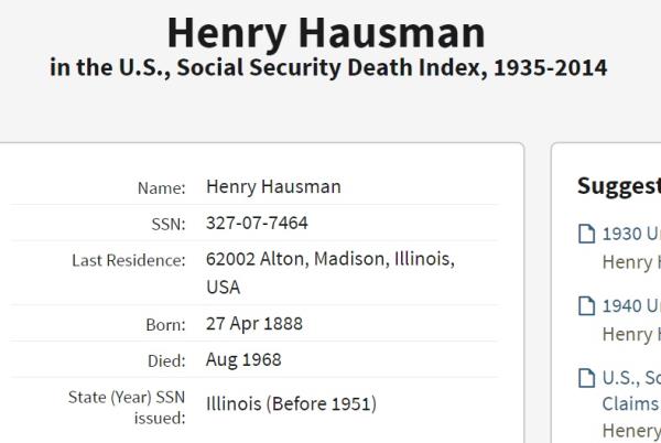 Henry August Hausman was born on April 27, 1888 in Alton, Madison, Illinois, USA. He and