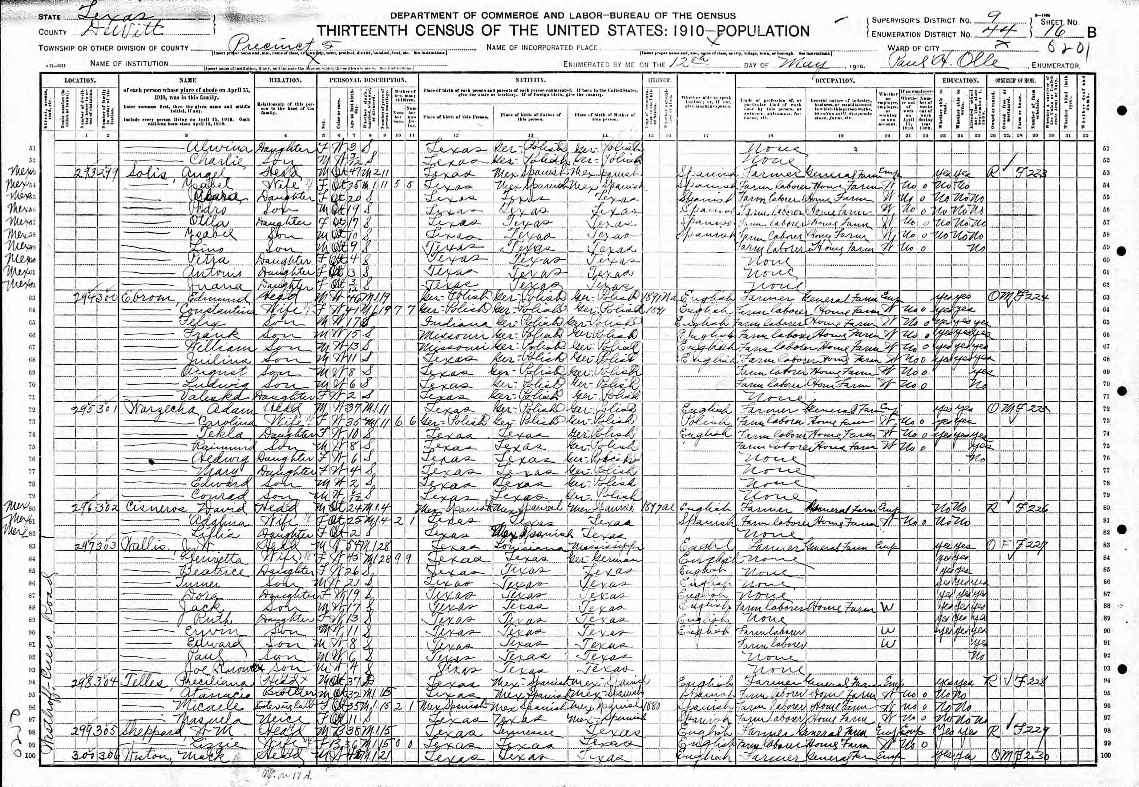 Wallis Family 1910 Federal Census Texas, lines 83-93