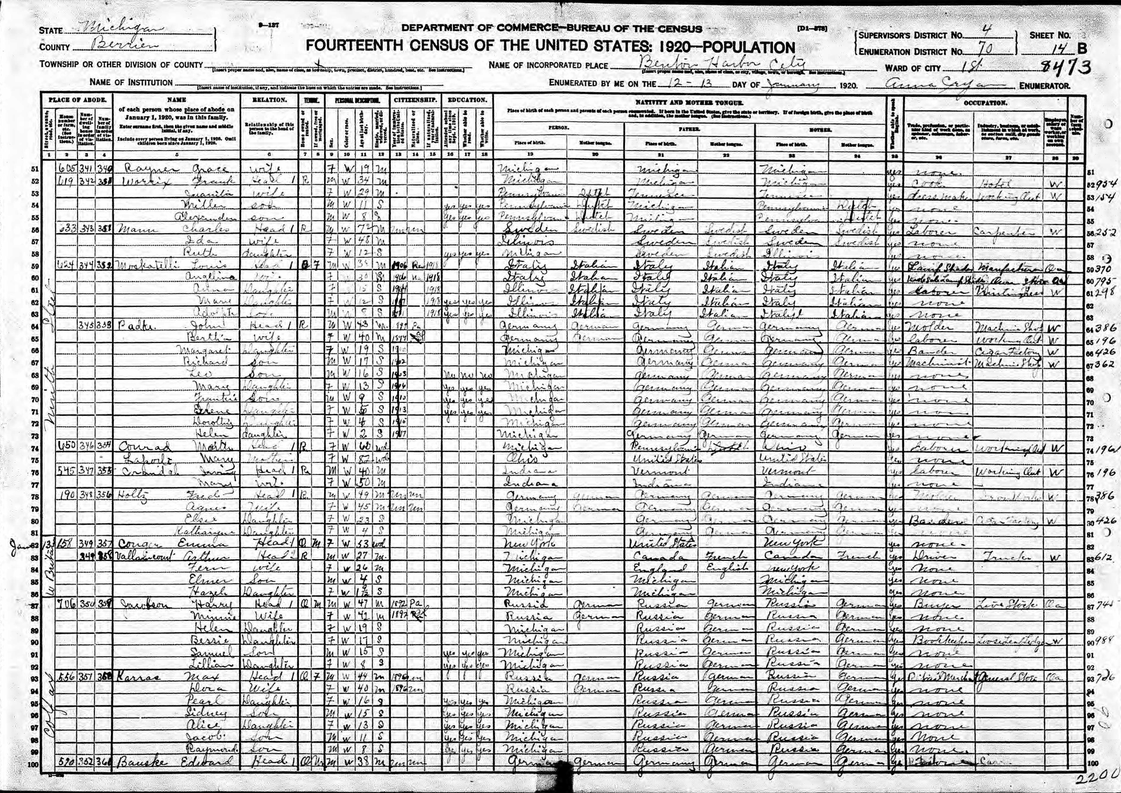 Moscardelli Family 1920 Federal Census Michigan, Lines 59-63