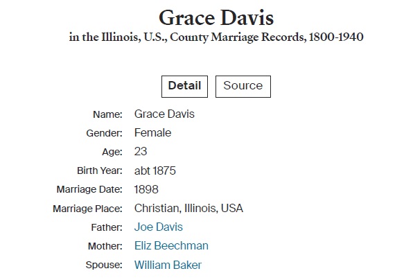 Grace Davis were married on June 13, 1898 in Christian, Illinois, USA. He died.