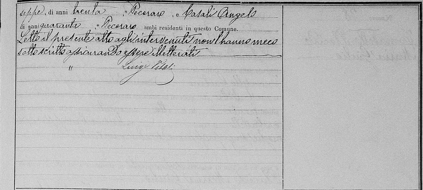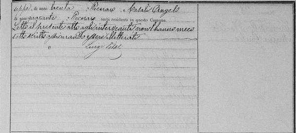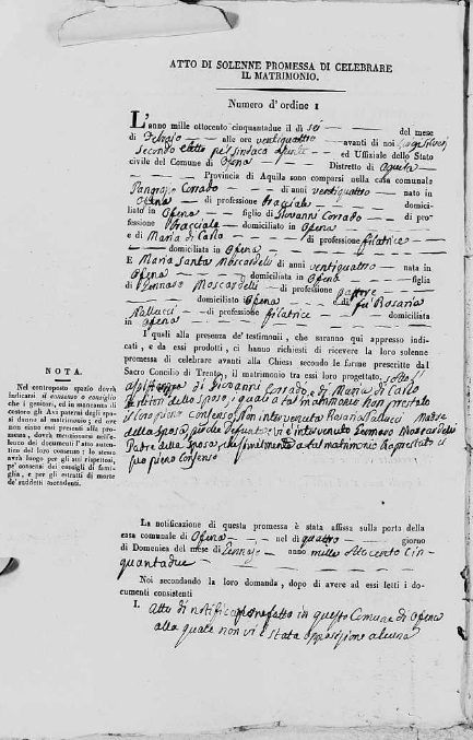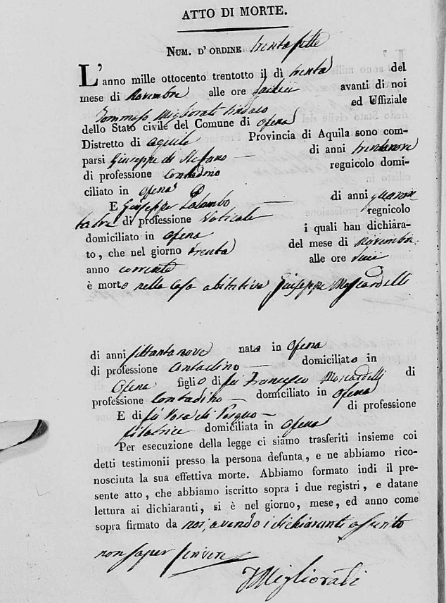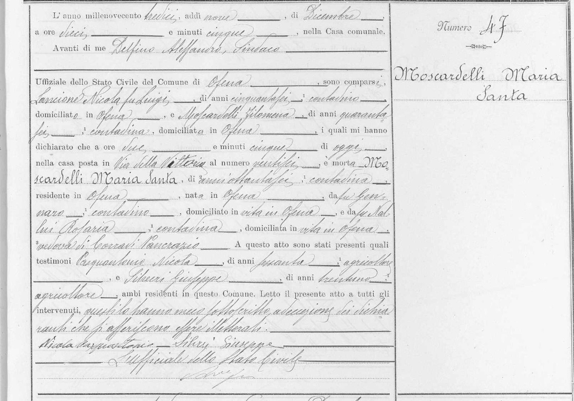 Maria Santa Moscardelli were married on February 7, 1852 in Ofena, L'Aquila, Abruzzo, Italy. He died on February 6, 1905, at age 78, in Ofena, L'Aquila, Abruzzo, Italy.