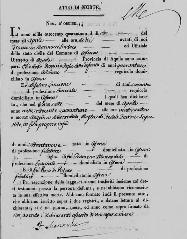 Diletta Pacione were married. He died on January 9, 1848, at age ~75, in Ofena, L'Aquila, Abruzzo, Italy.