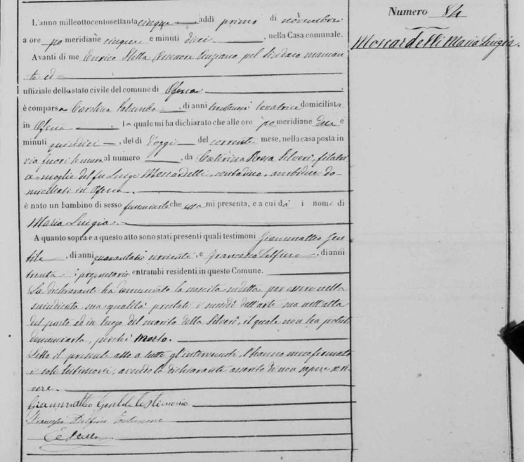 Maria Luigia Moscardelli was born on November 1, 1875 in Ofena, L'Aquila, Abruzzo, Italy. She died on September 20, 1876, at age 0, in Ofena, L'Aquila, Abruzzo, Italy.
