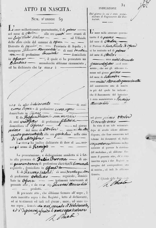 Remigio Moscardelli was born on October 1, 1847 in Ofena, L'Aquila, Abruzzo, Italy. He and