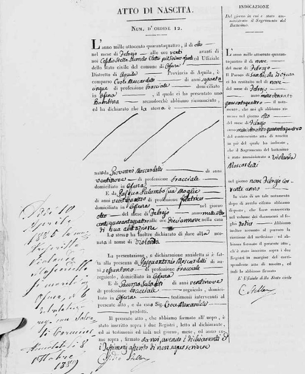 Violanda Moscardelli was born on February 8, 1844 in Ofena, L'Aquila, Abruzzo, Italy. She and