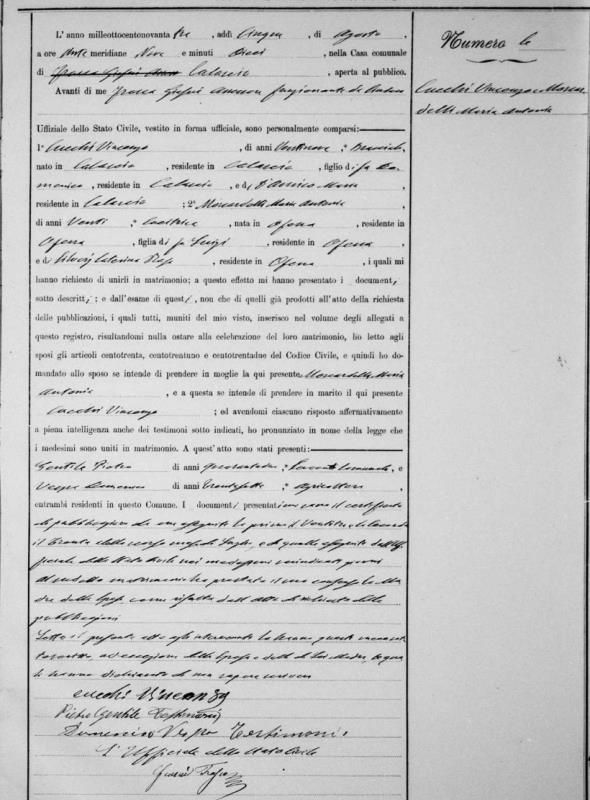 Vincenzo "Jim" Cucchi were married on August 5, 1893 in Calascio, L'Aquila, Abruzzo, Italy. She died in 1946, at age ~73.