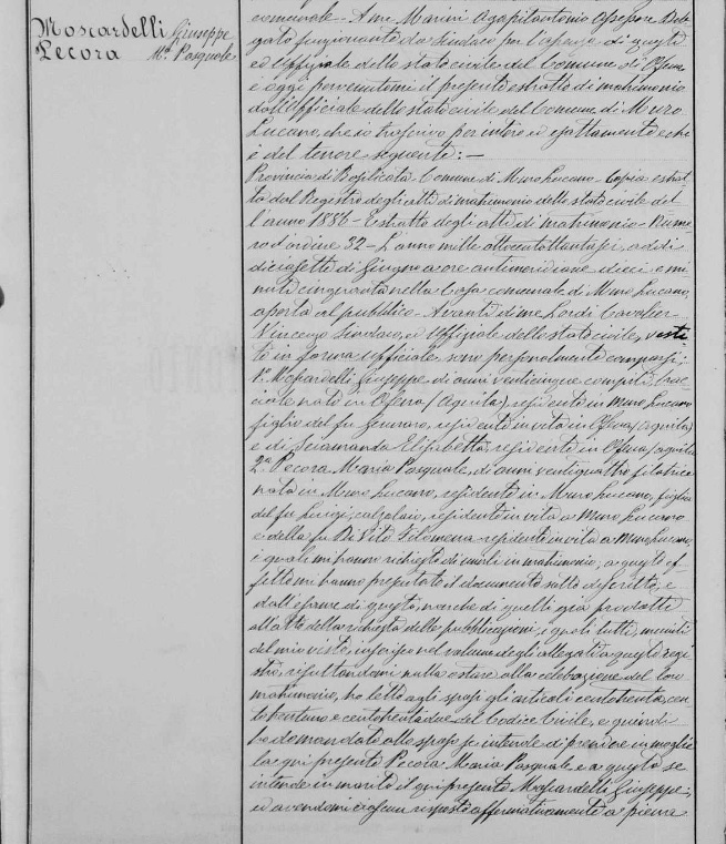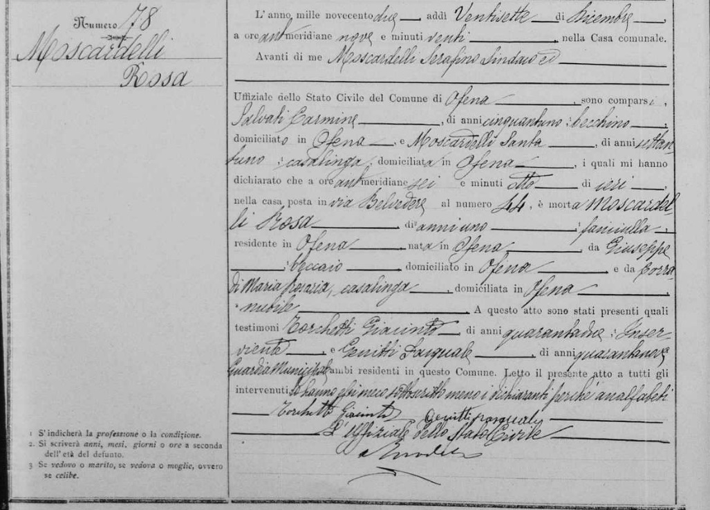 Giuseppe Moscardelli were married on June 17, 1886 in Muro Lucano, Potenza, Basilicata, Italy. She died.