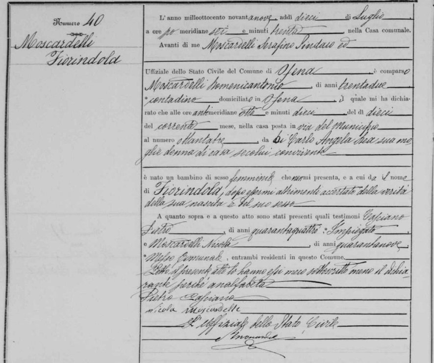 Fiorindola Moscardelli was born on July 10, 1899 in Ofena, L'Aquila, Abruzzo, Italy. She died.
