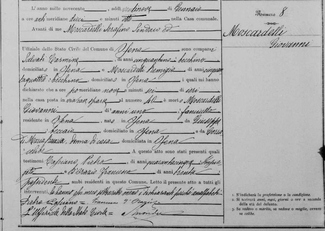 Giovanni Moscardelli was born on November 4, 1898 in Ofena, L'Aquila, Abruzzo, Italy. He died on January 29, 1900, at age 1, in Ofena, L'Aquila, Abruzzo, Italy.
