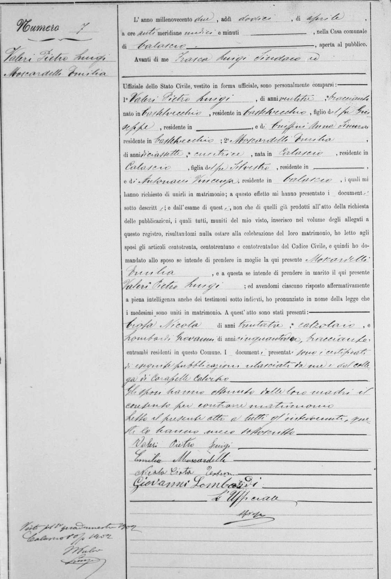 Pietro Luigi Valeri were married on April 12, 1902 in Calascio, L'Aquila, Abruzzo, Italy. She and