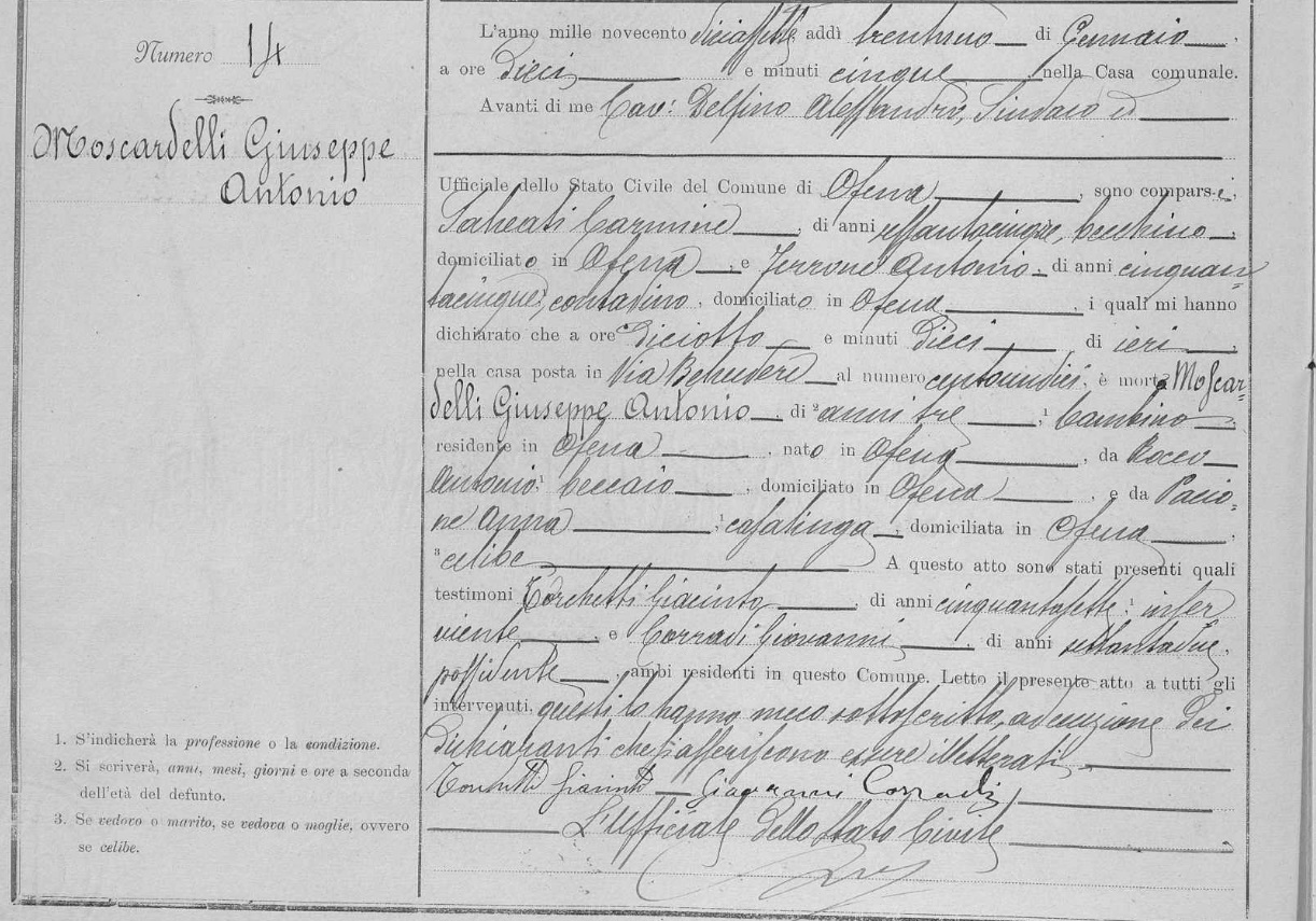 Giuseppe Antonio Moscardelli was born in 1915 in Ofena, L'Aquila, Abruzzo, Italy. He died on January 31, 1917, at age ~2, in Ofena, L'Aquila, Abruzzo, Italy.