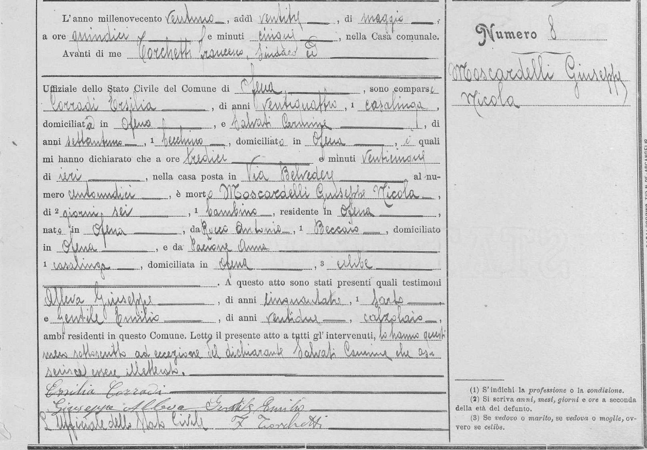 Giuseppe Nicola Moscardelli was born on May 17, 1921 in Ofena, L'Aquila, Abruzzo, Italy. He died on May 22, 1921, at age 0, in Ofena, L'Aquila, Abruzzo, Italy.