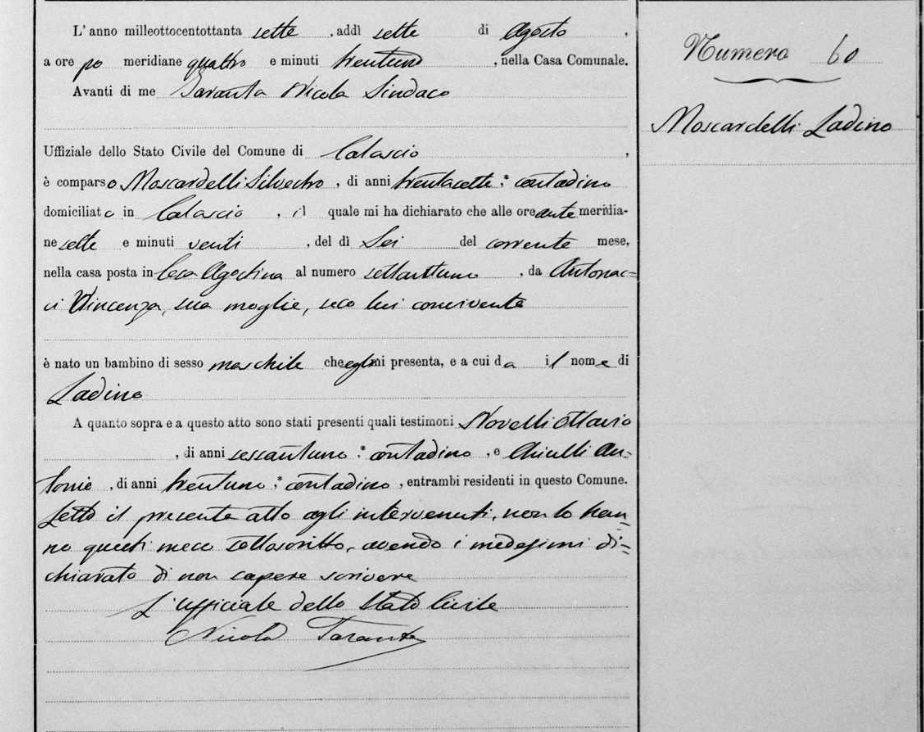 Ladino Moscardelli was born on August 6, 1887 in Calascio, L'Aquila, Abruzzo, Italy. He died on August 16, 1888, at age 1, in Calascio, L'Aquila, Abruzzo, Italy.