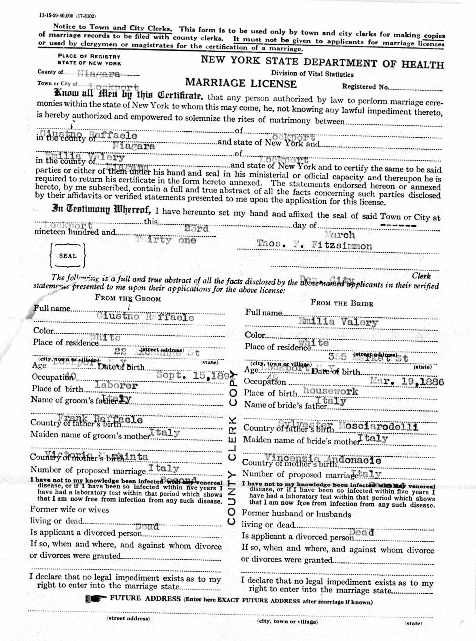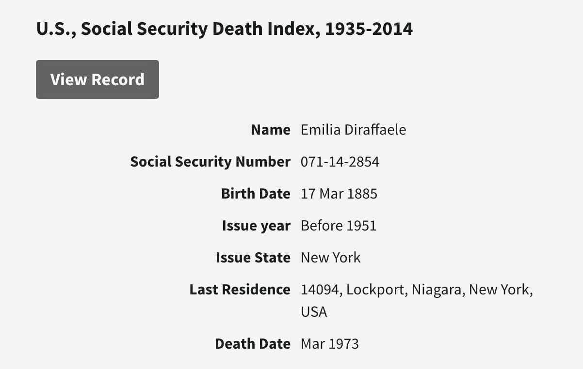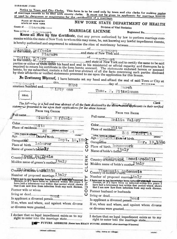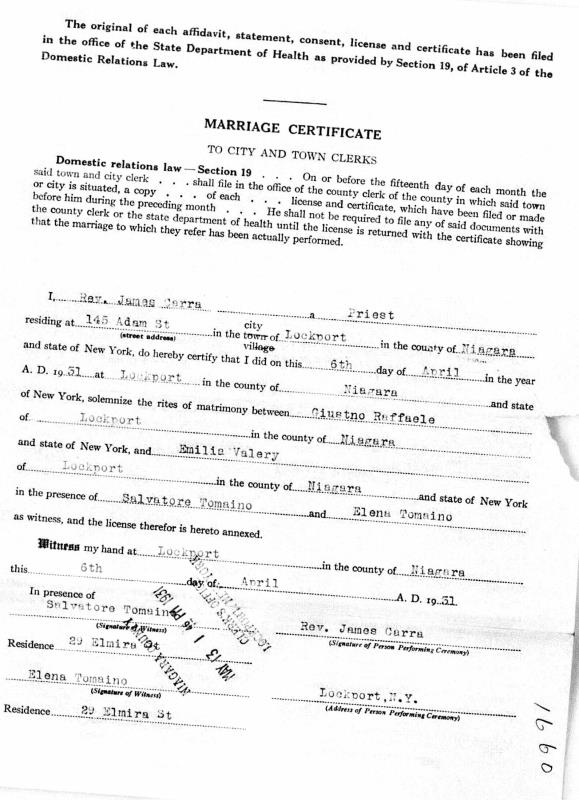 Giustino Di Raffaele were married on April 6, 1931 in Lockport, Niagara, New York, USA. She died on March 24, 1973, at age 88, in Lockport, Niagara, New York, USA. She was buried in Saint Patrick's Cemetery, Lockport, New York.
