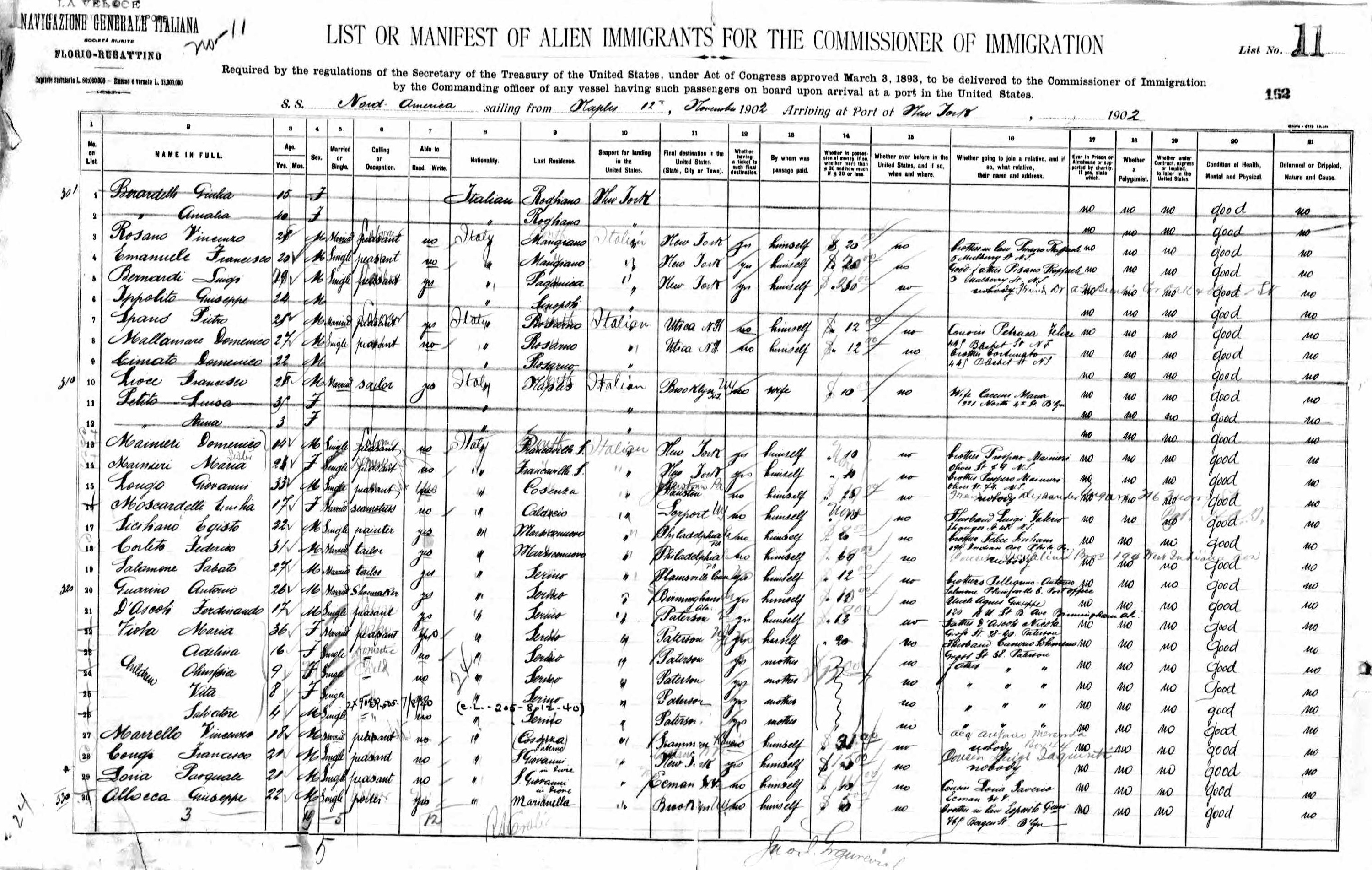 Emilia Mosccardelli 1902 Ship Departure Manifest, Line 16