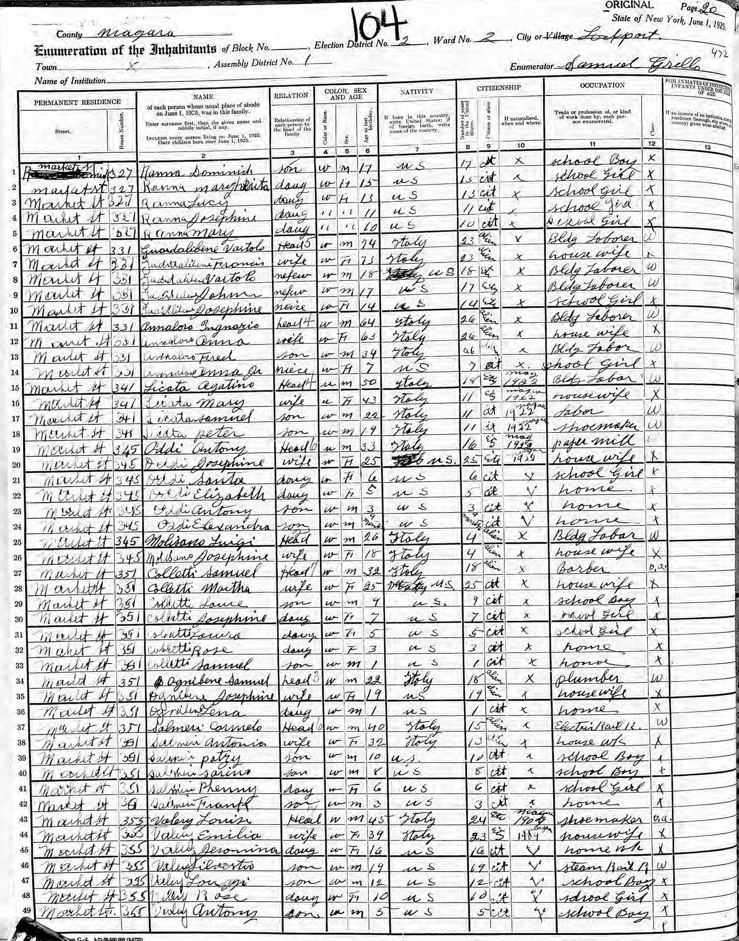 Valeri Family 1925 State Census New York, Lines 43-49