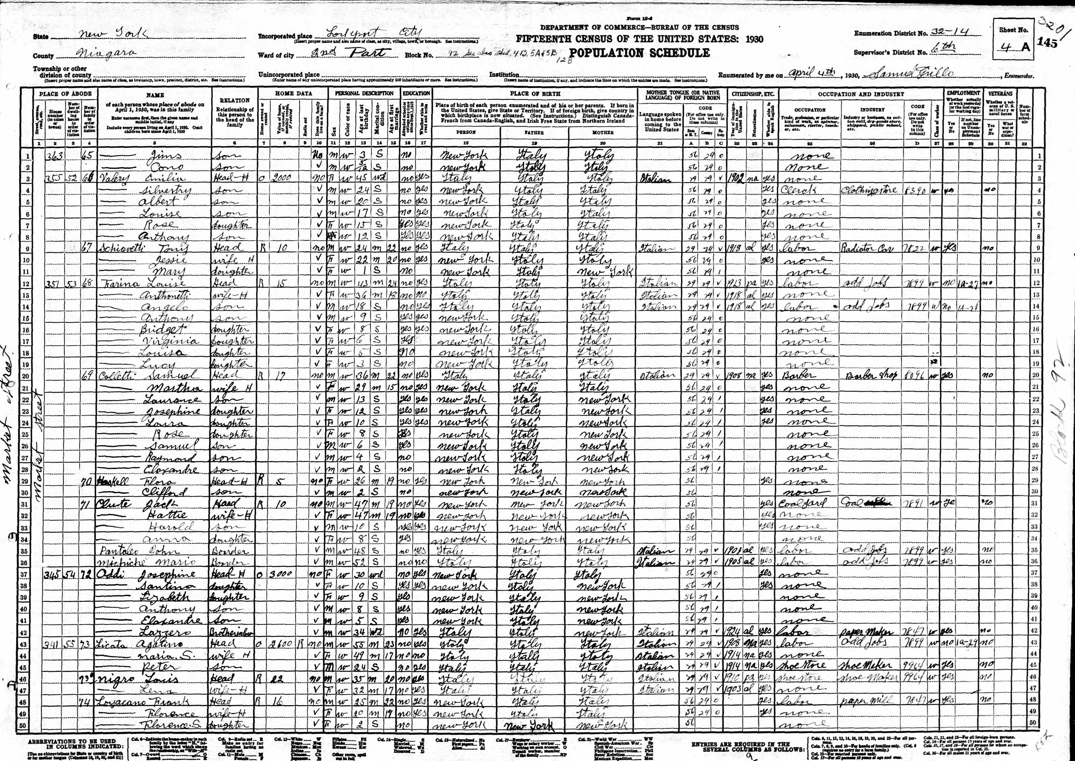 Valeri Family 1930 Federal Census New York, Lines 3-8