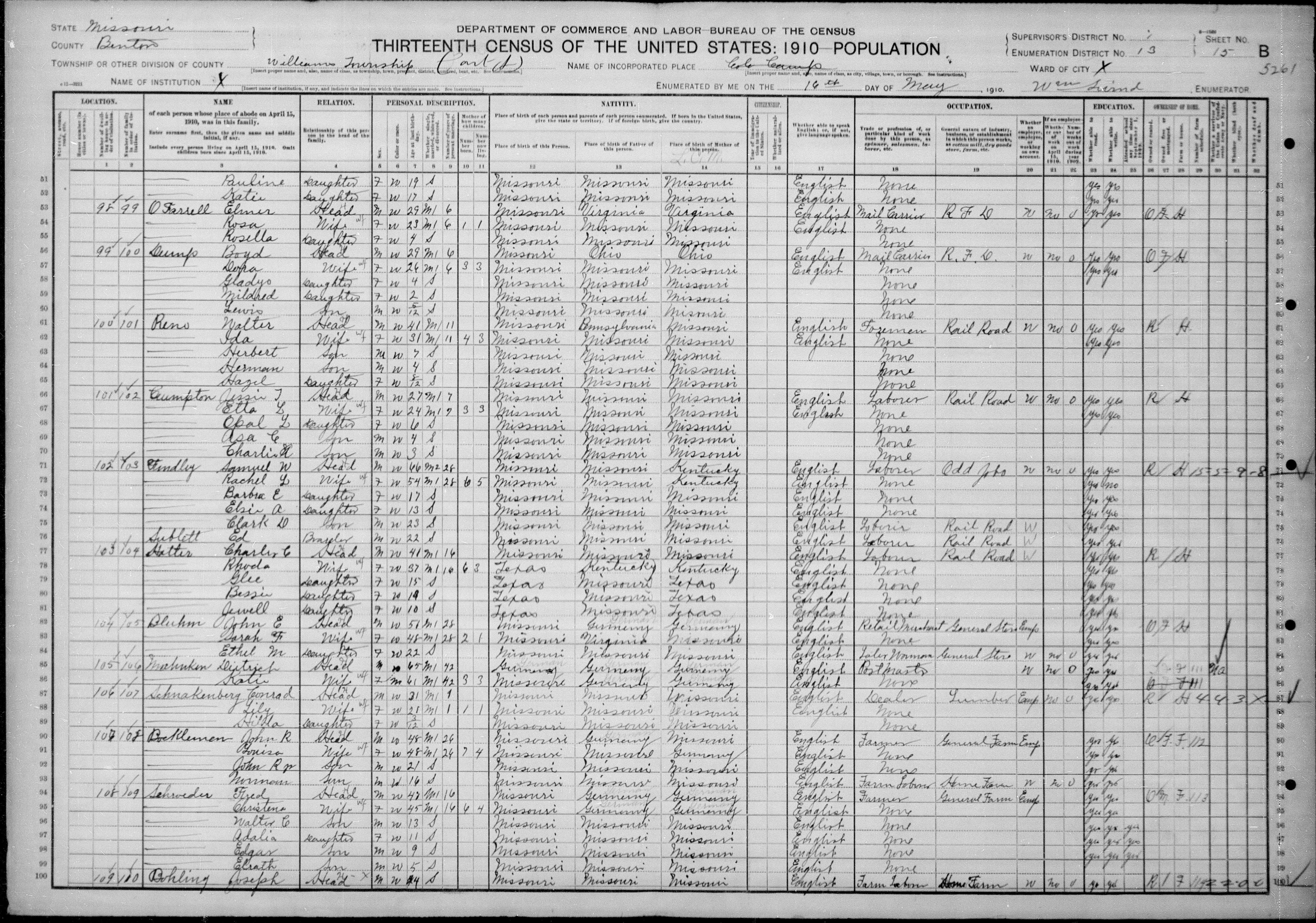 Cumpton Family 1910 Federal Census, Missouri, Lines 66-70