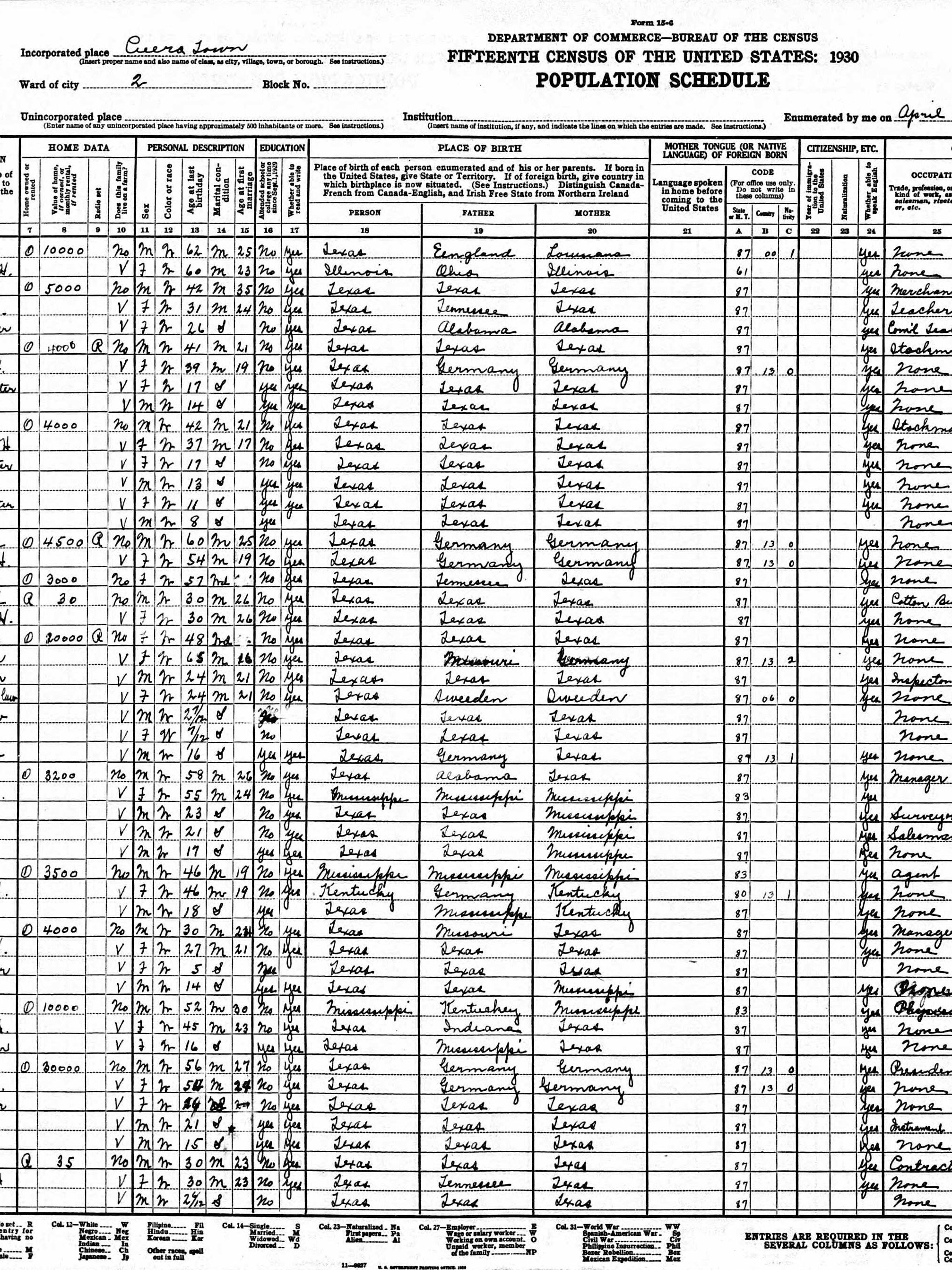 Wallis Family 1930 Federal Census Texas, lines 21-27
