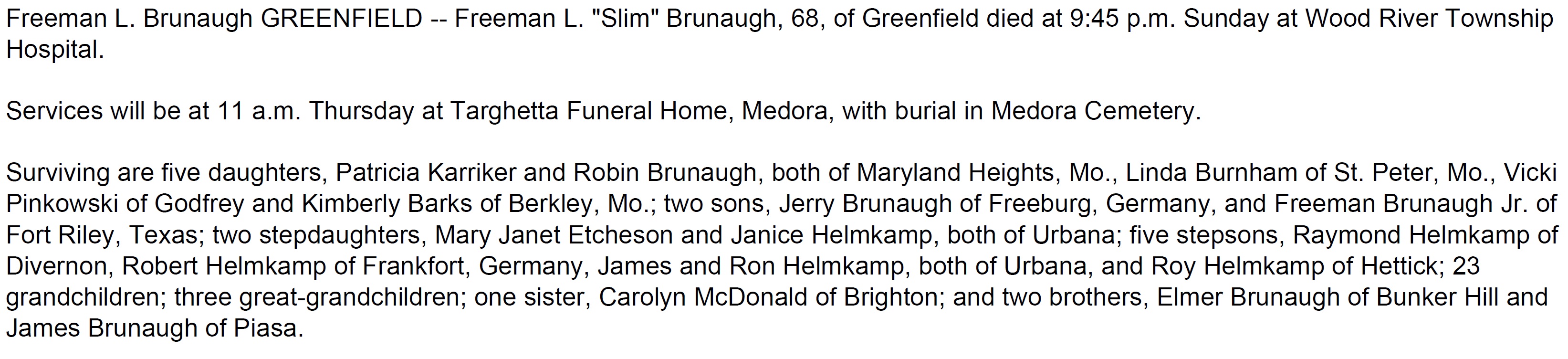 Freeman Lindley "Slim" Brunaugh, Sr., was born on September 28, 1920 in Pike, Illinois, USA. He and