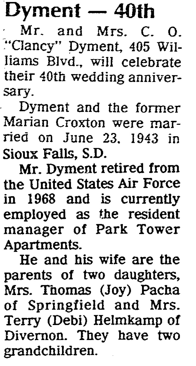 C.O. "Clancy" Dyment were married on June 23, 1943 in Sioux Falls, Minnehaha, South Dakota, USA. She died.