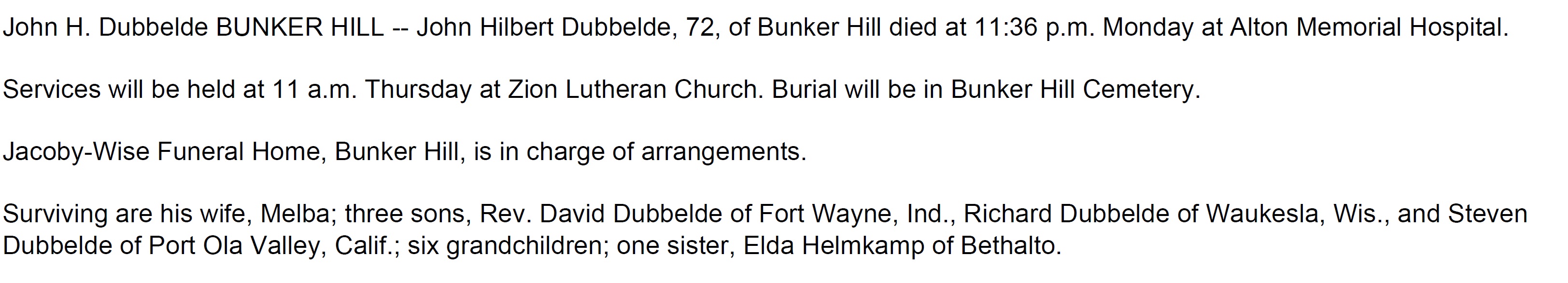 Melba were married. He died on May 18, 1987, at age ~74, in Bunker Hill, Macoupin, Illinois, USA. He was buried in Bunker Hill Cemetery, Bunker Hill, Illinois.