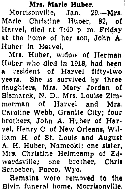 Herman Huber were married. She died on January 29, 1943, at age ~82, in Morrisonville, Christian, Illinois, USA.