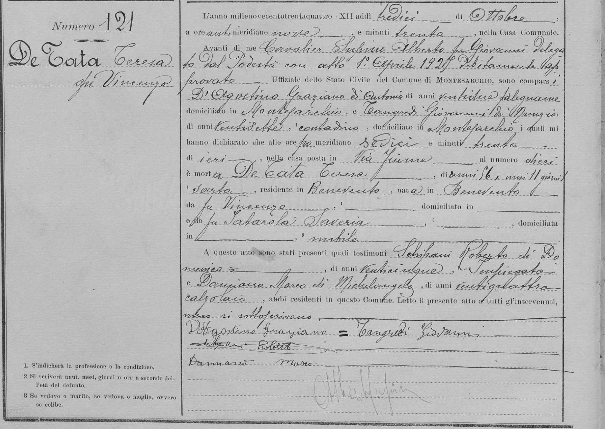 Teresa De Tata was born on November 10, 1877 in Benevento, Benevento, Campania, Italy. She died on October 12, 1934, at age 56, in Montesarchio, Benevento, Campania, Italy.