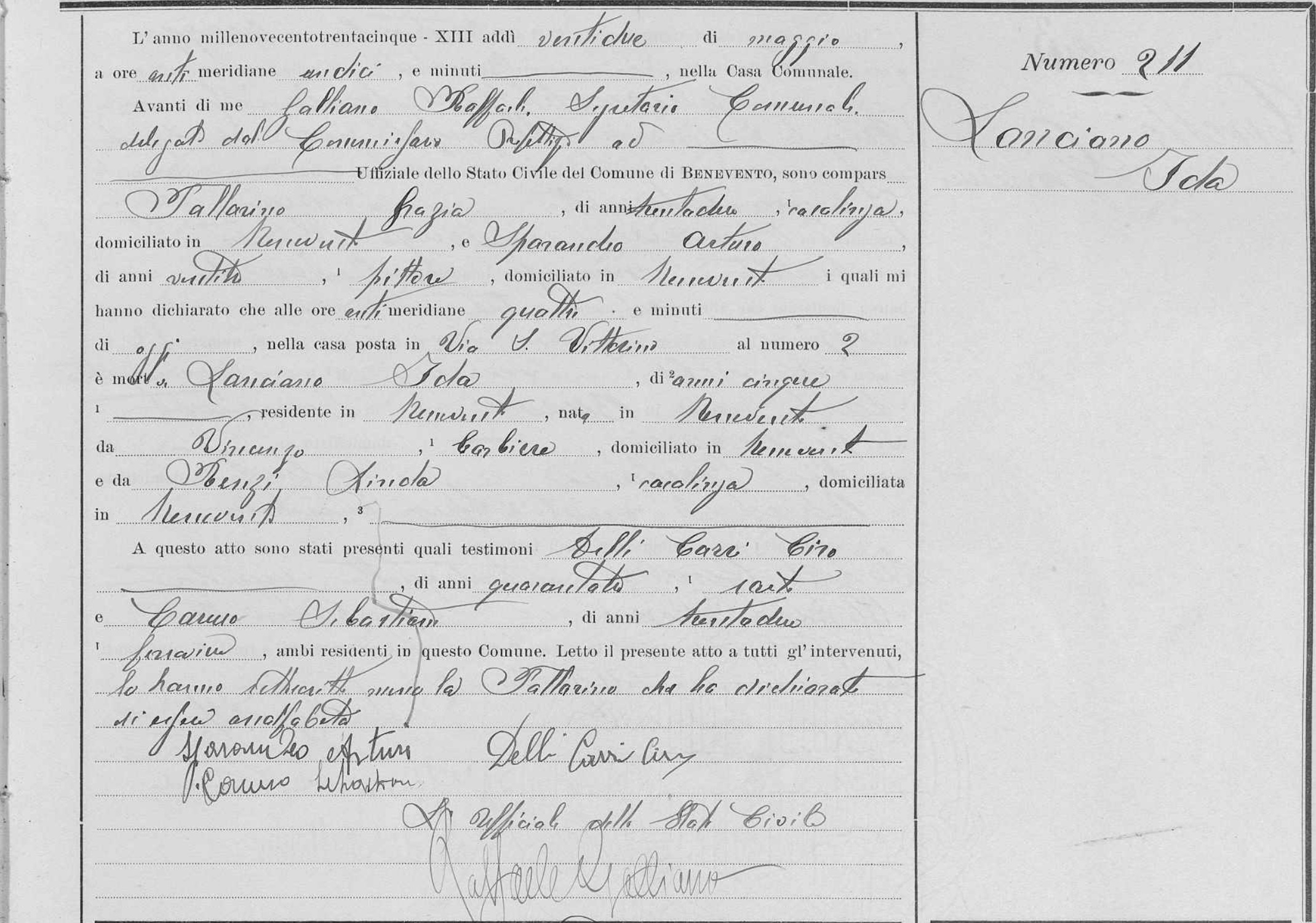 Benedetta Ievolella were married on October 6, 1861 in Benevento, Benevento, Campania, Italy. He died.