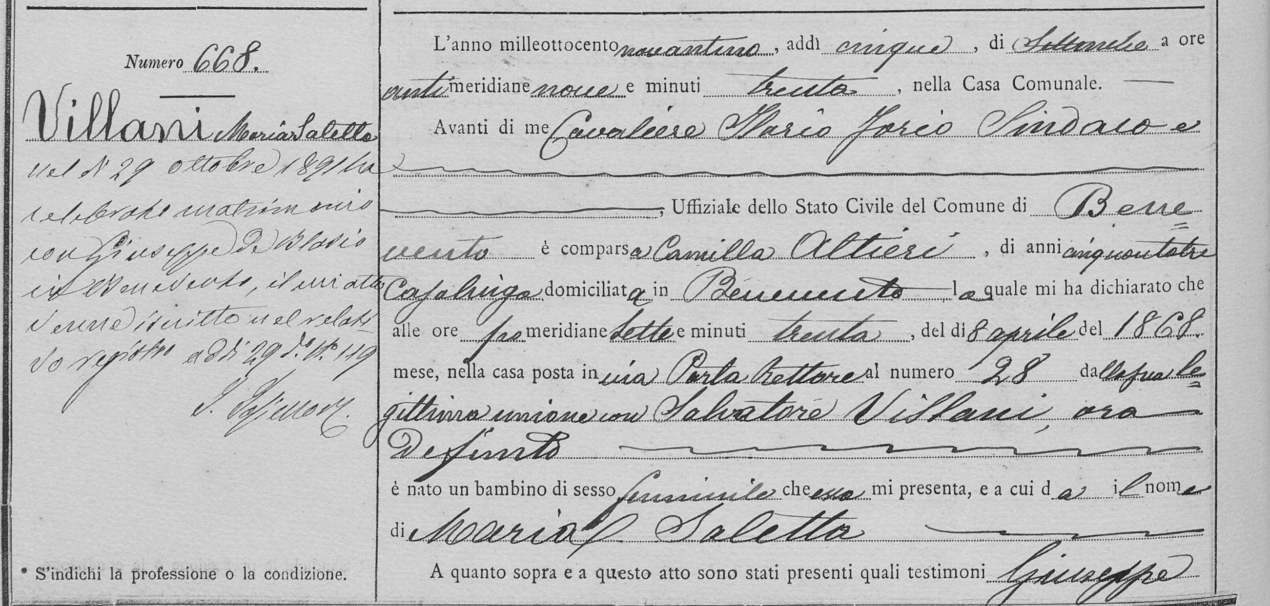 Maria Saletta Villani was born on April 8, 1868 in Benevento, Benevento, Campania, Italy. She and