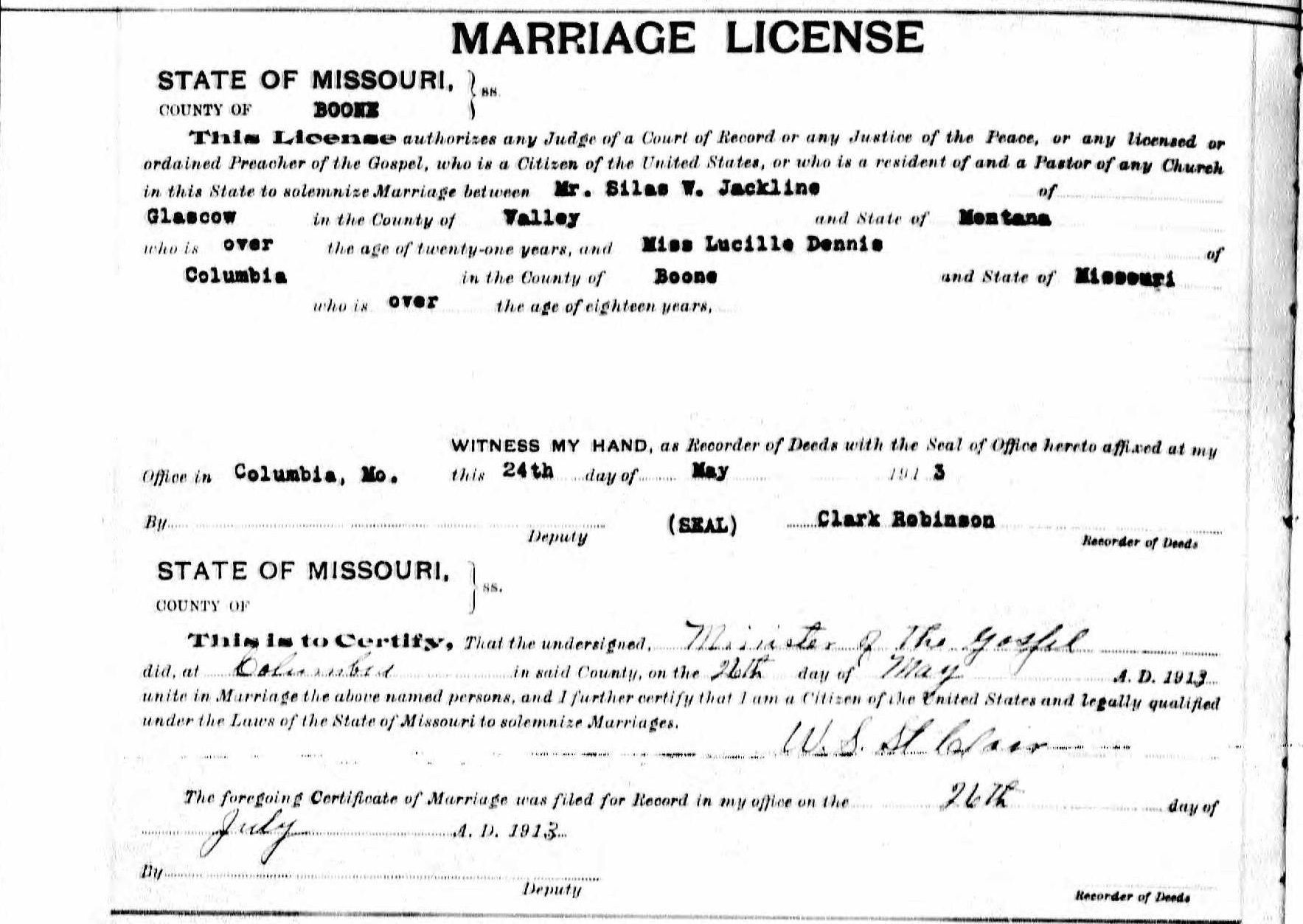 Silas Wesley Jackline were married on May 26, 1913 in Columbia, Boone, Missouri, USA. She died on August 25, 1973, at age 78, in Fair Oaks, Sacramento, California, USA. She was buried in Fair Oaks, Sacramento, California, USA.