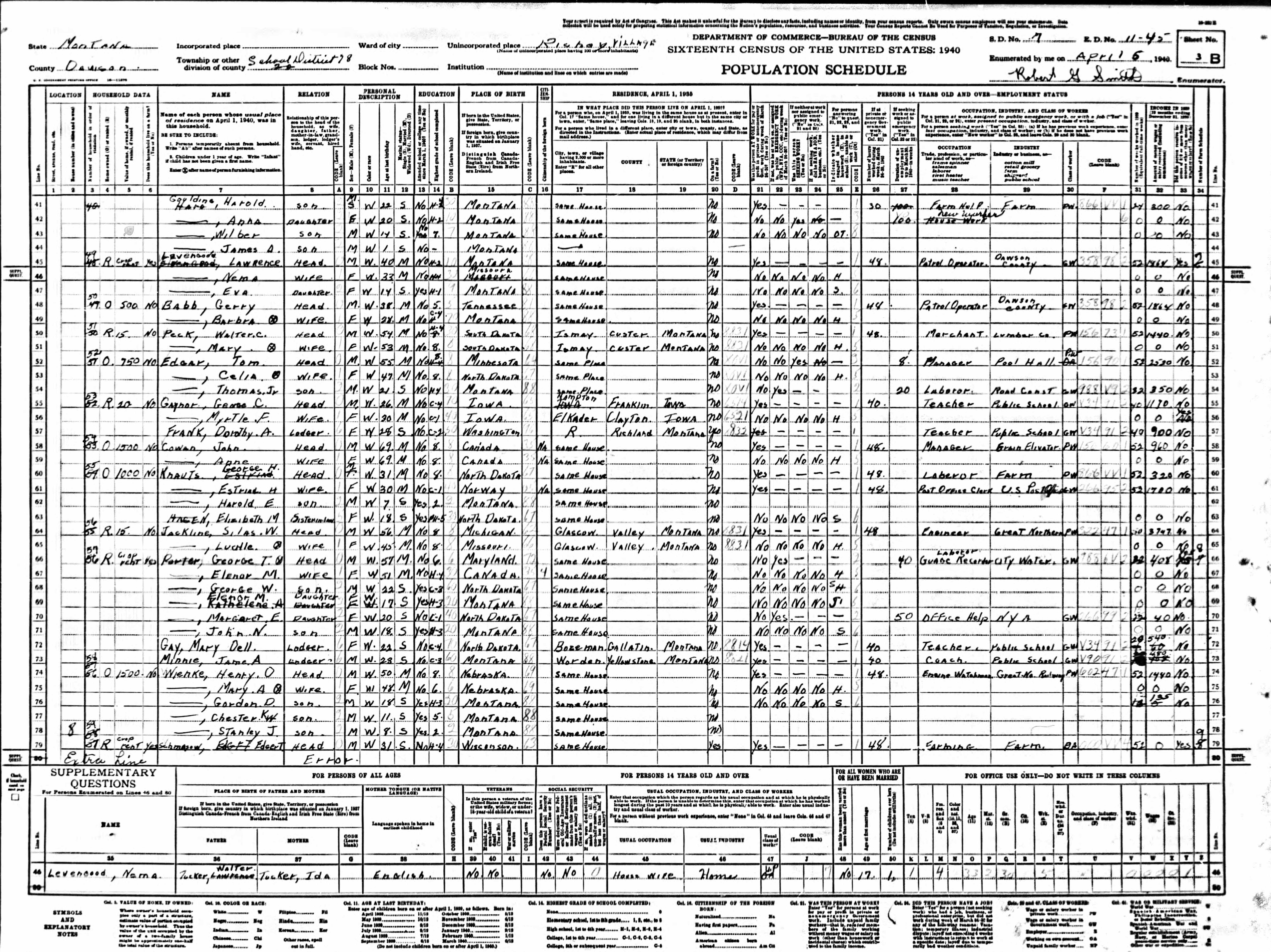 Jackline Family 1940 Federal Census Montana, Lines 64-66