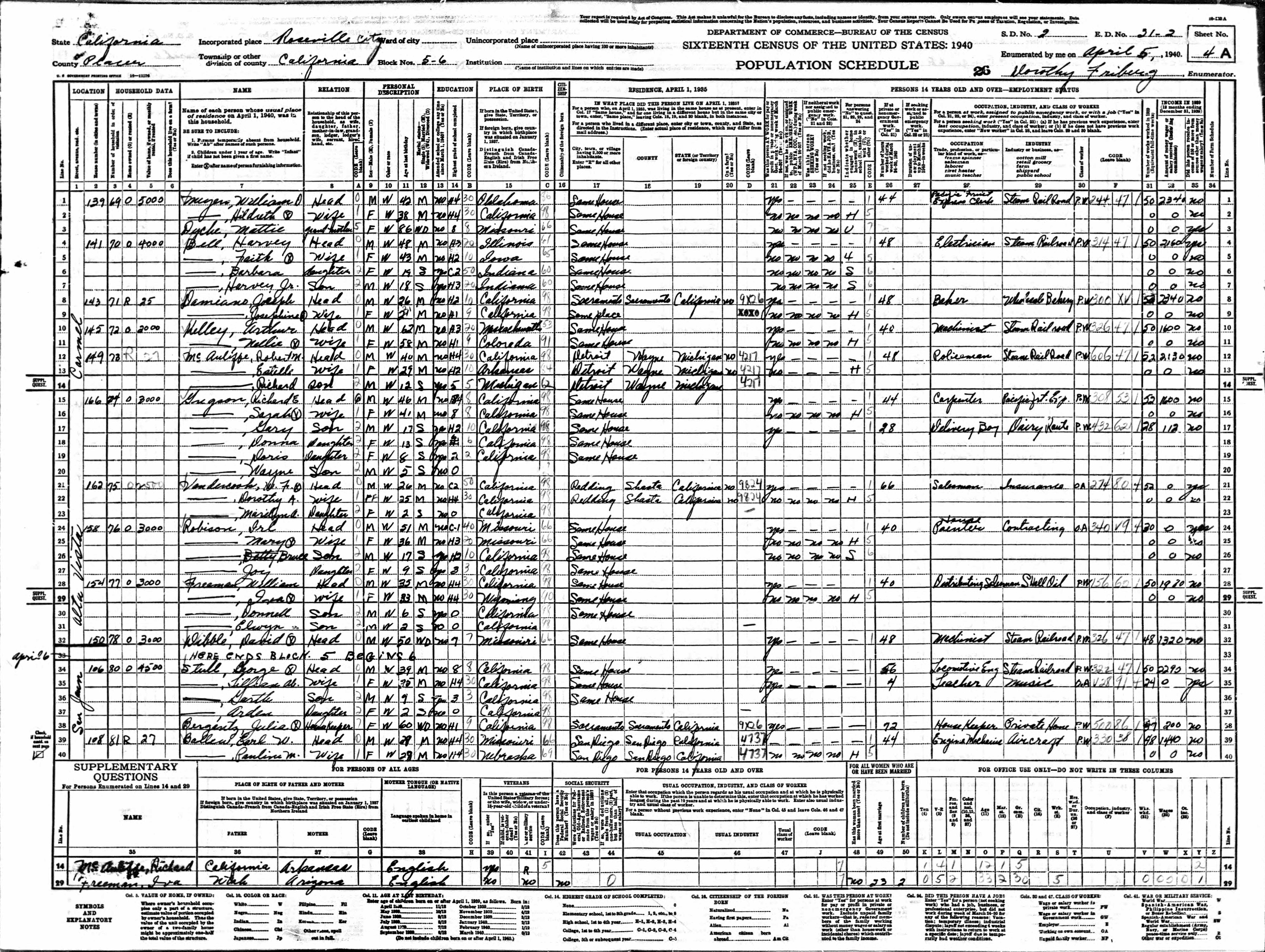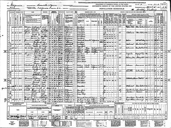 Gregson Family 1940 Federal Census California, Lines 15-20