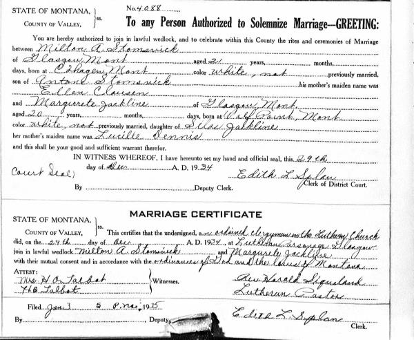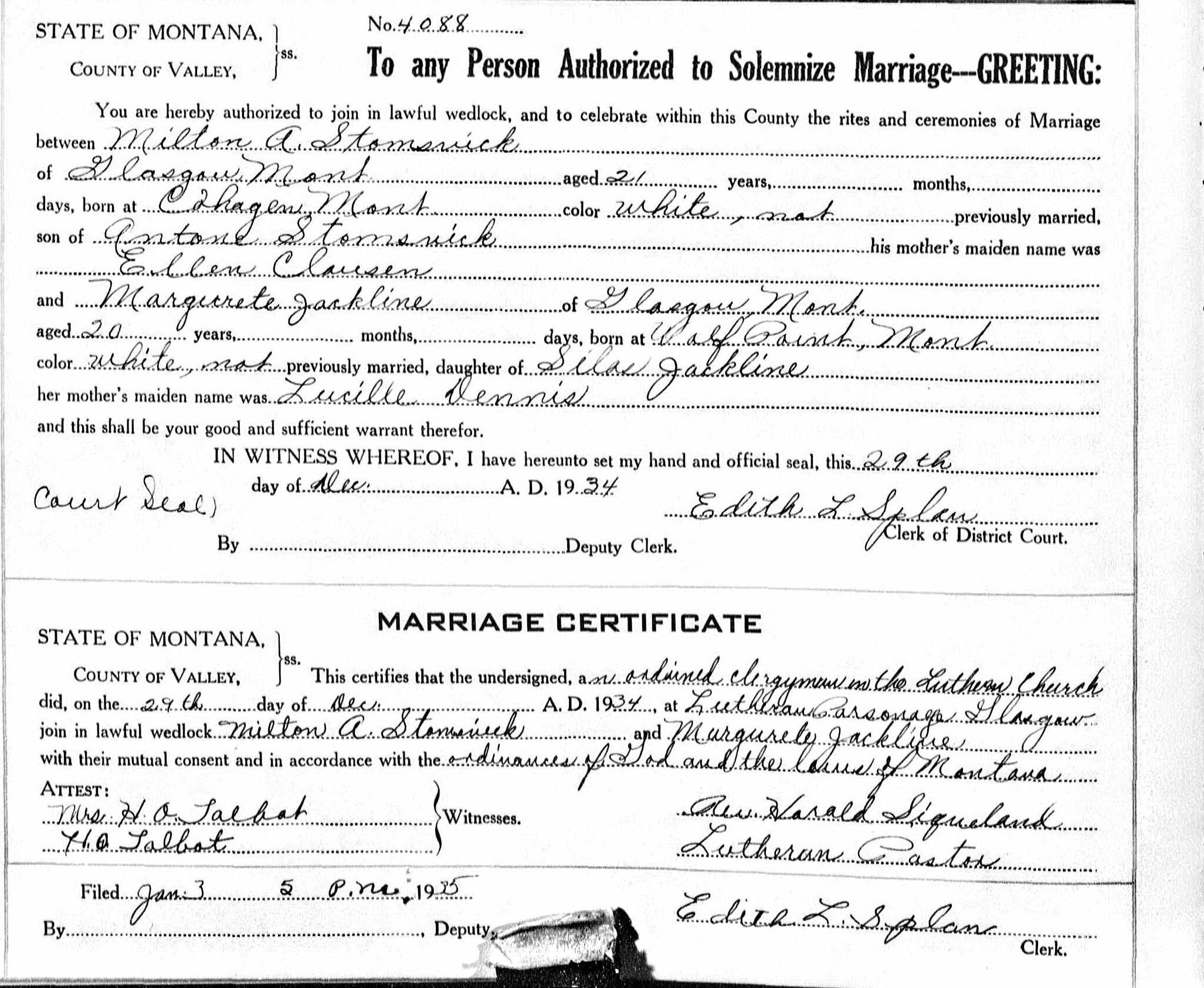 Milton A. Stomsvik were married on December 29, 1934 in Glasgow, Valley, Montana, USA. She died.